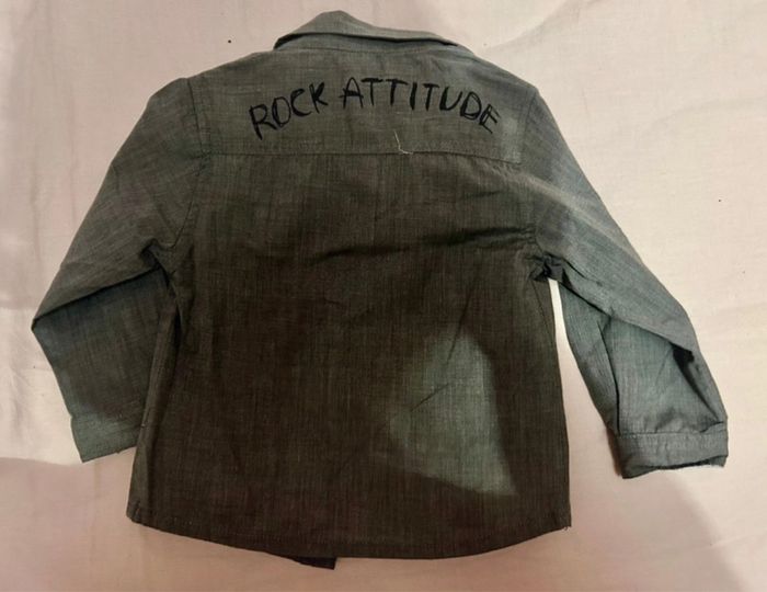 Sa couleur gris foncé lui donne un style chic avec une petite touche moderne grâce au détail brodé « rock attitude » sur la poitrine. Les manches peuvent se porter retroussées et se fixent avec un bouton, pratique et stylé.