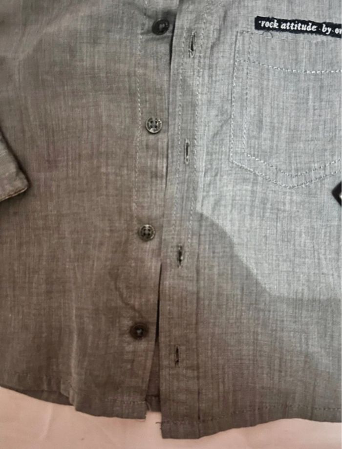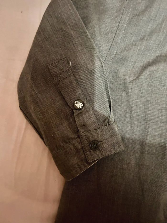 🔹 Détails : Col chemise, fermeture boutonnée, manches retroussables, petit texte brodé