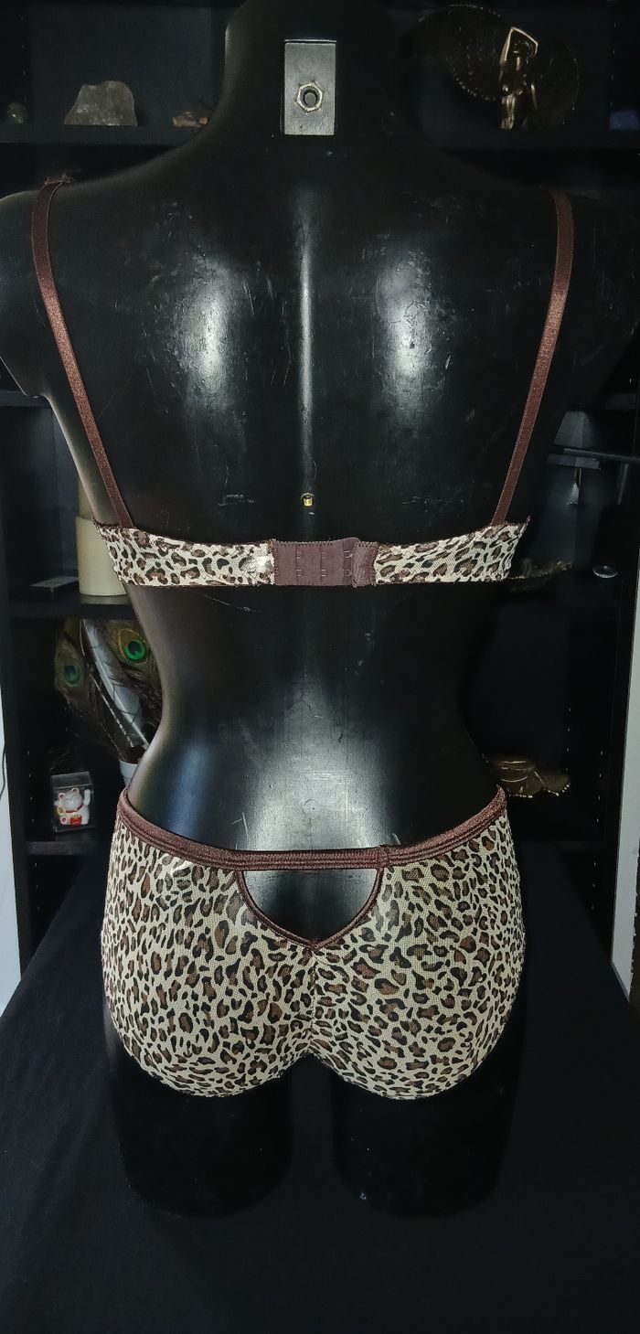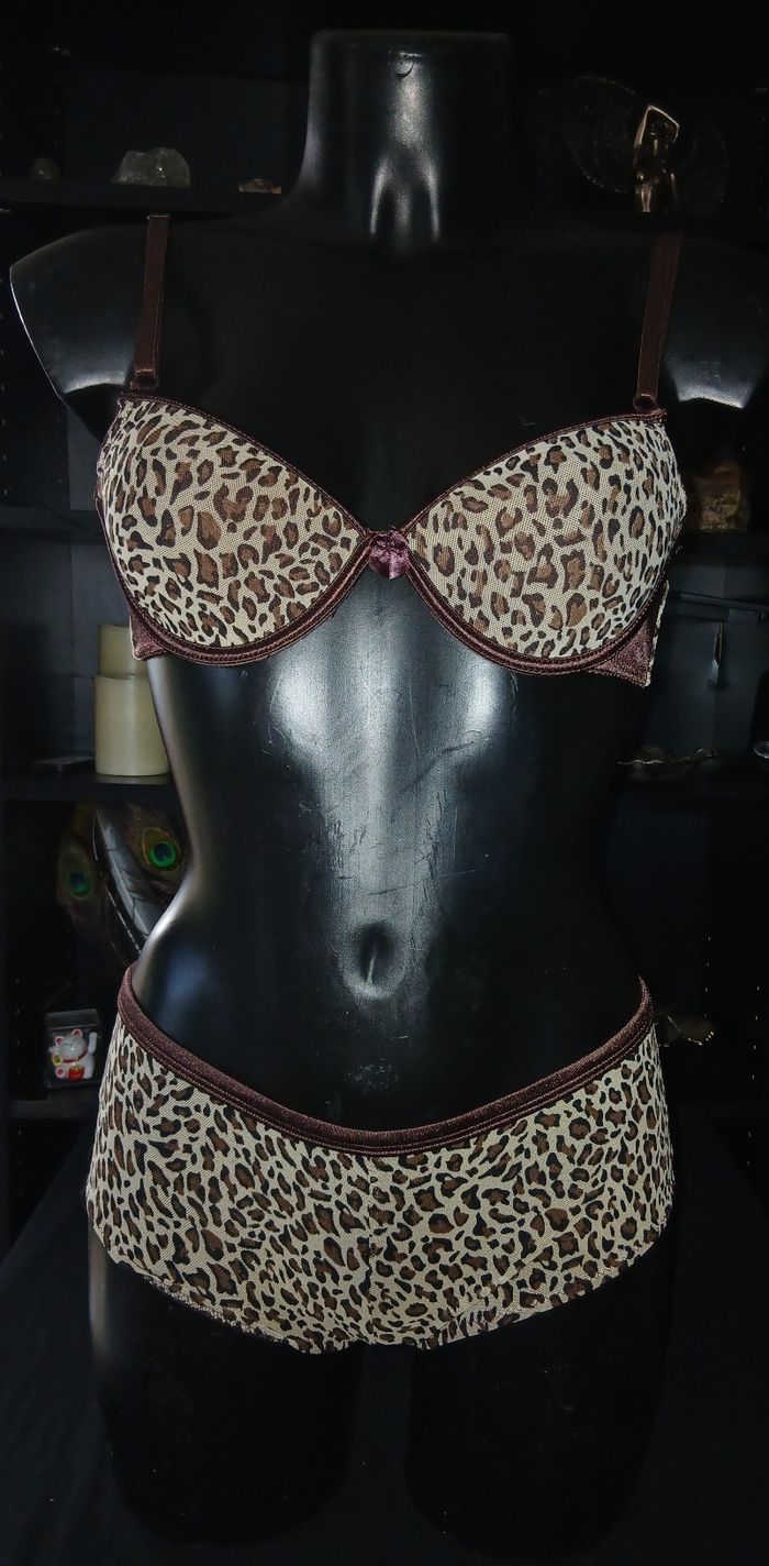 Très bel ensemble sous vêtements Motifs taches Léopard Beige et Marron, Noir Bretelles réglable Fermeture par agrafes au dos Bonnet Rembourrer Taille 90 B Tanga Taille M Neuf sans étiquettes Jamais porté