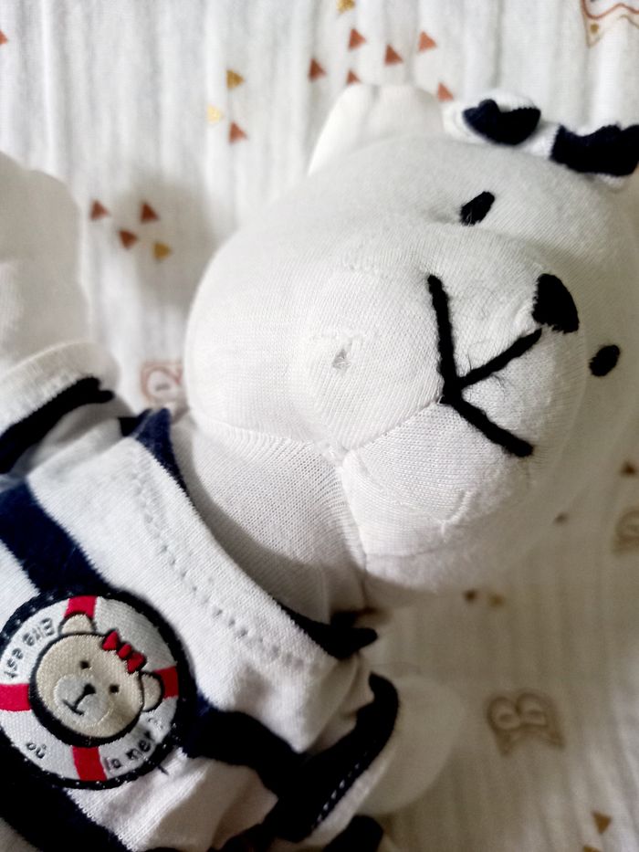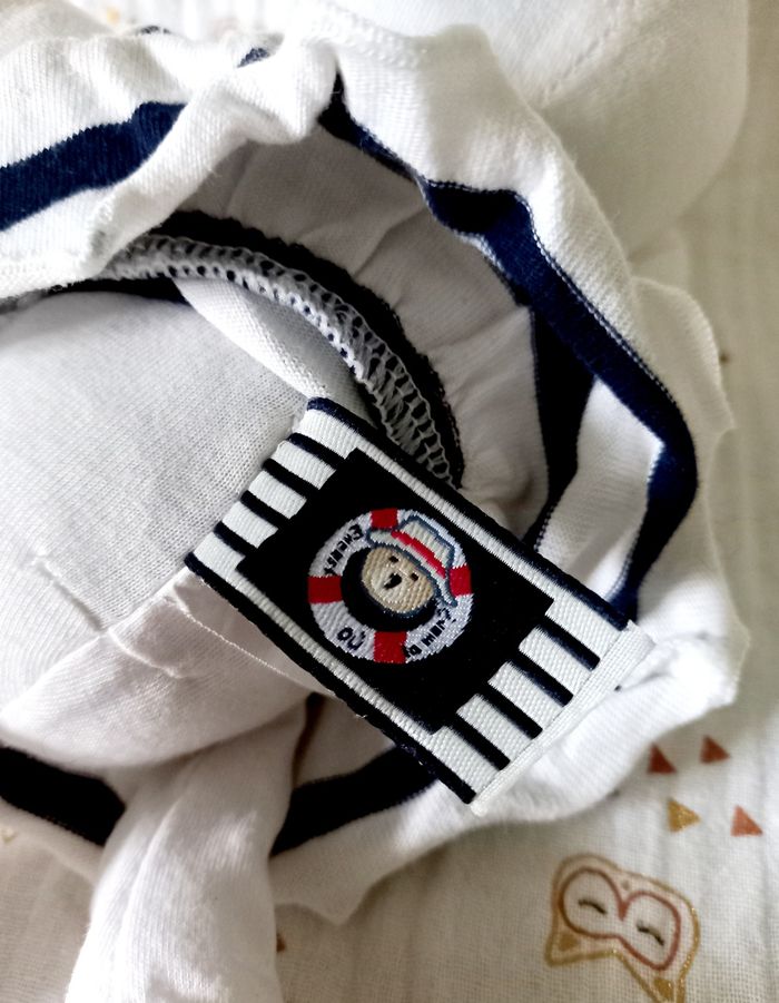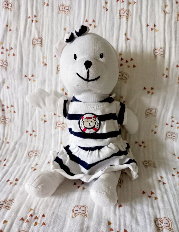 Doudou ours Oursonne blanc bleu rayé Elle Est Où La Mer. Très bon état 📮 Envoi rapide et soigné