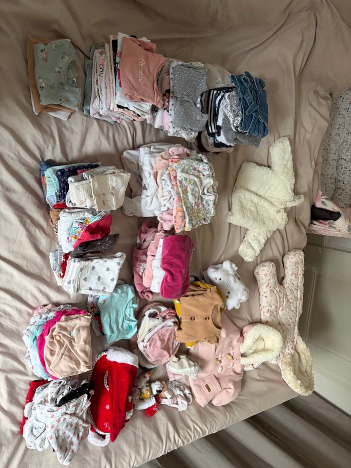 Je vends un lot de 122 articles comprenant : 2 manteaux,1 combinaison, 17 hauts fins,7 pulls,15 pyjamas,13 robes, 3 gilets, 22 pantalons, 1 ensemble, 4 combinaisons, 21 bodys, 4 t-shirts, 8 bavoirs, 1 body + pyjama+ pantalon et bonnet de noël,(chaussettes, collants, bandeaux sont offerts). Il y a de toute marques. Le tout est en bon état.