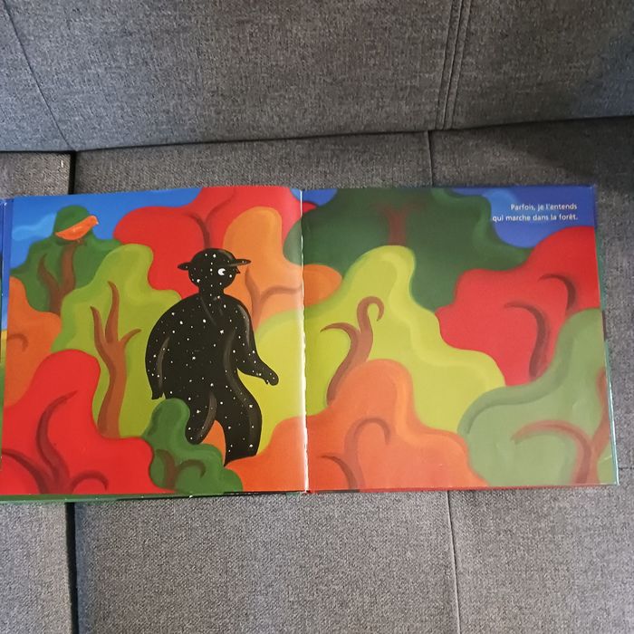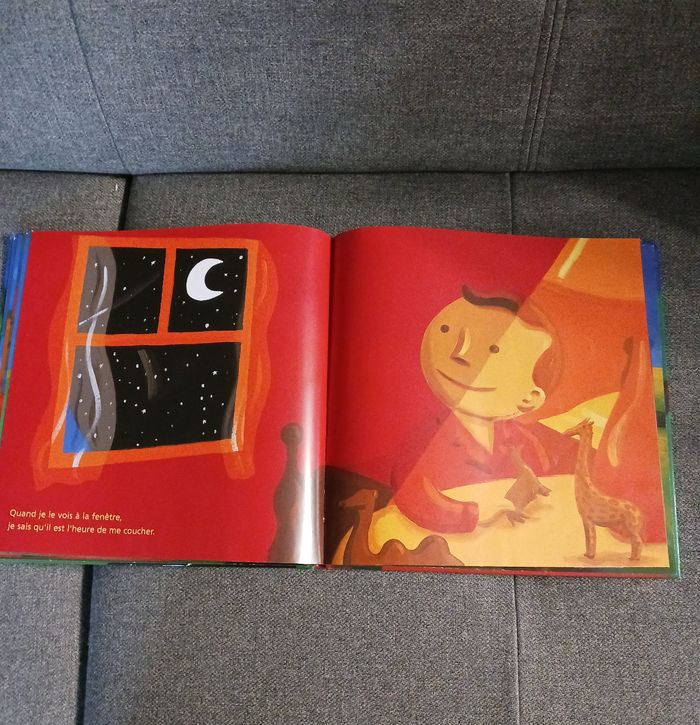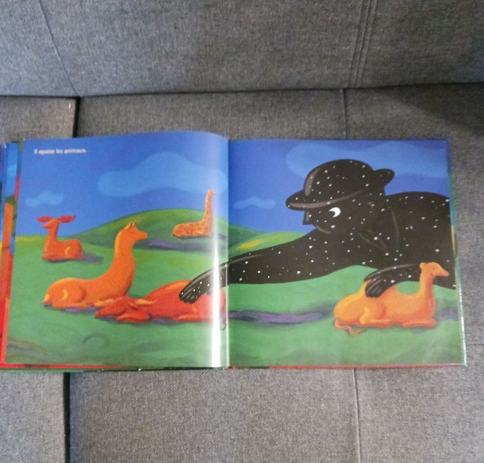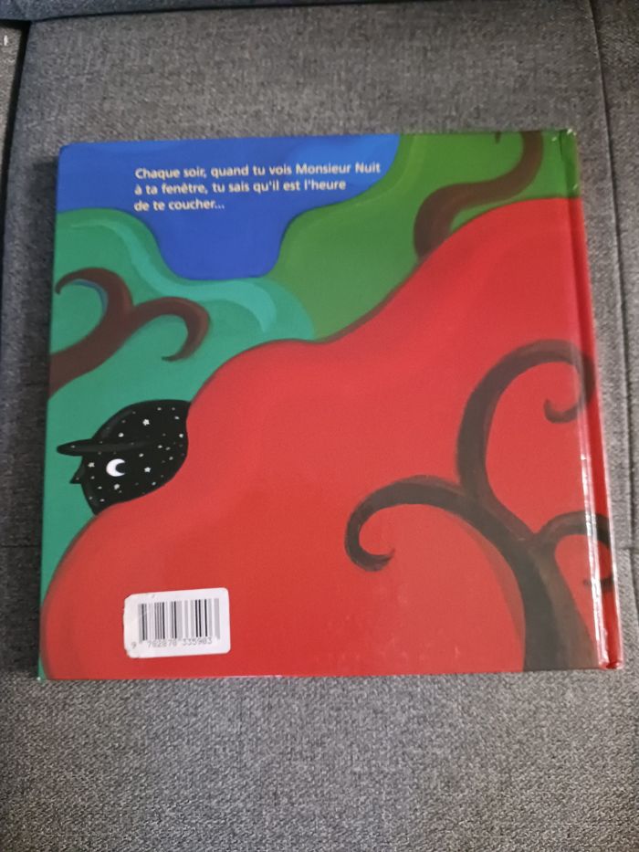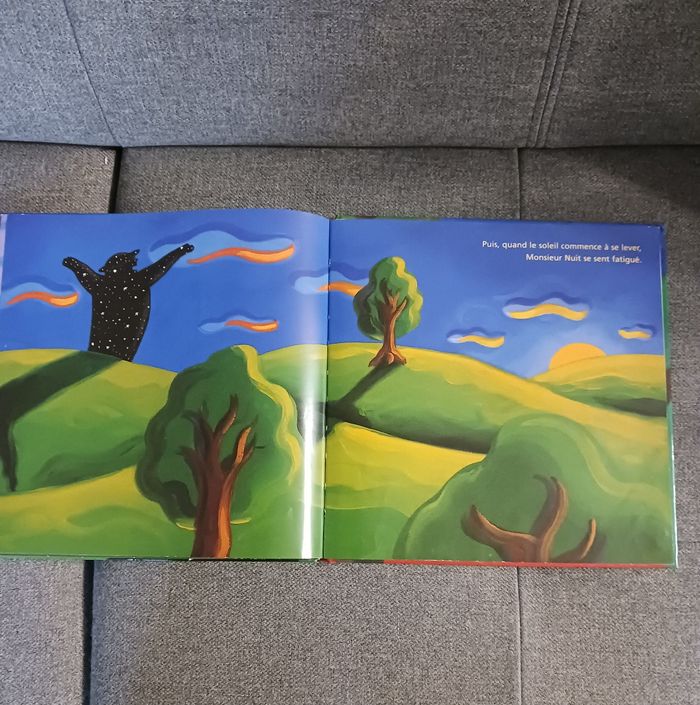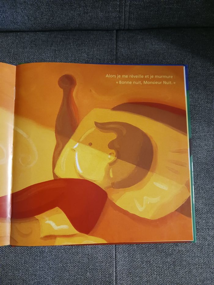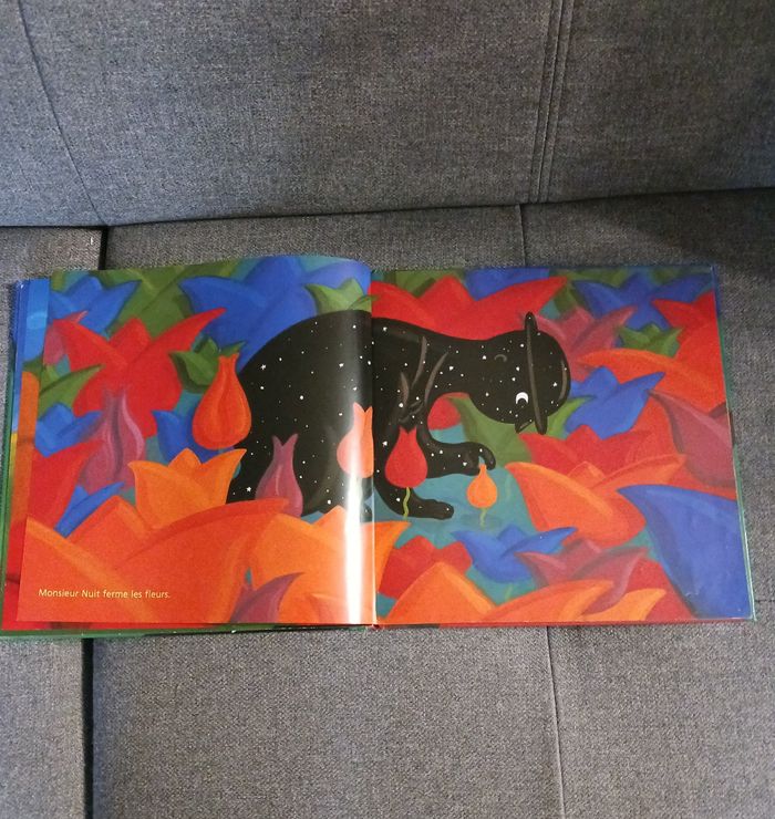 Au coucher du soleil, monsieur Nuit se lève. Il ferme les fleurs, apaise les animaux, calme la mer ... Une vision poétique et imagée de la nuit. La dernière page sans écriture a été coupée car une petite main rapide l'avait déchirée, sinon le livre est en très bon état