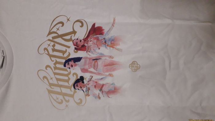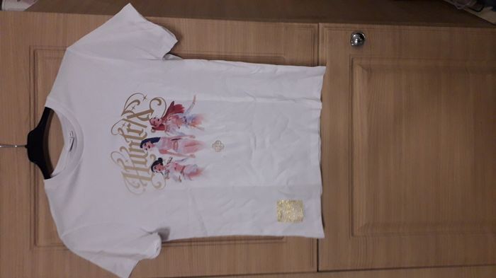 Design officiel Kpop Demon Hunters (Netflix) Impression Huntrix dorée et détaillée Matière 100 % coton douce et confortable Patch brillant Kpop Demon Hunters au bas du t-shirt vendu dans sa boite d'origine jamais porté