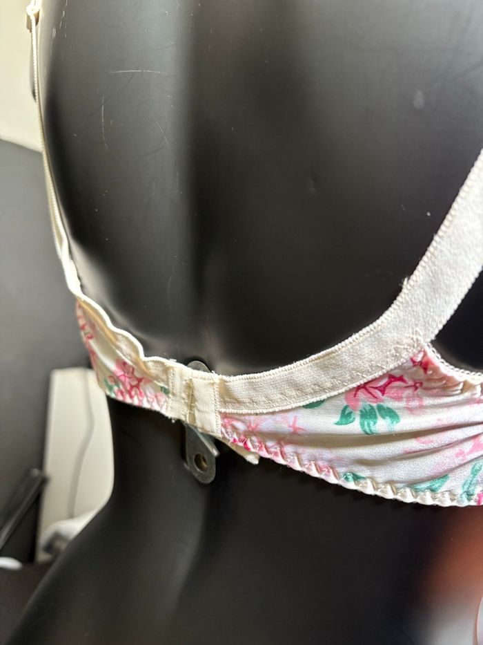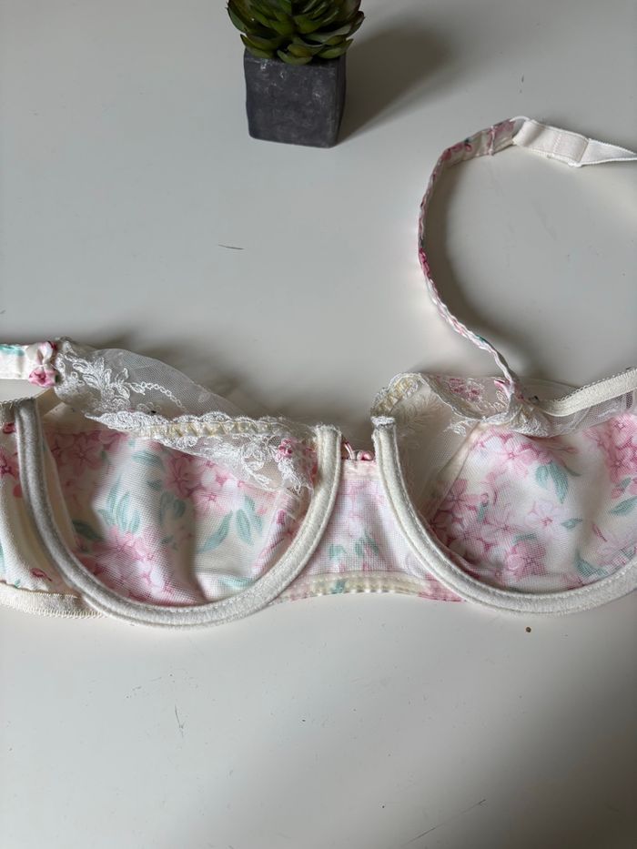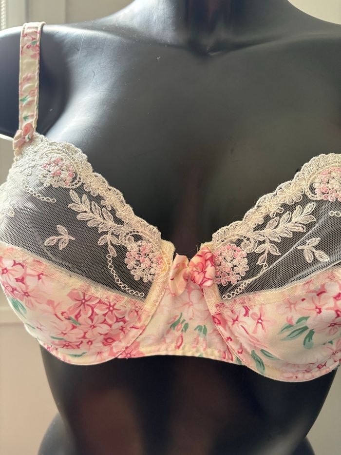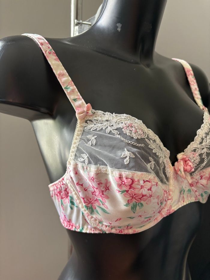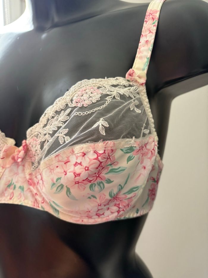 Élégant soutien-gorge Antinéa, couleur beige délicat rehaussé de jolies fleurs roses et de fins détails en dentelle.