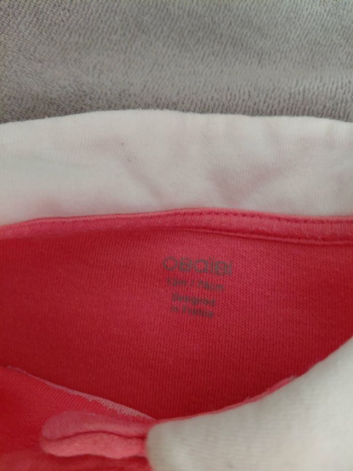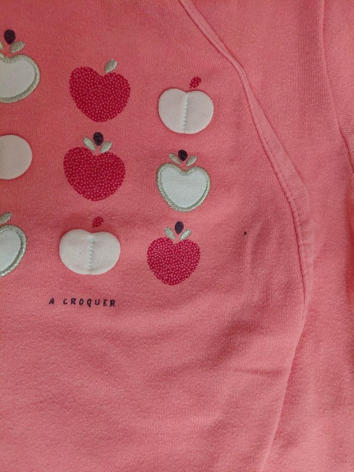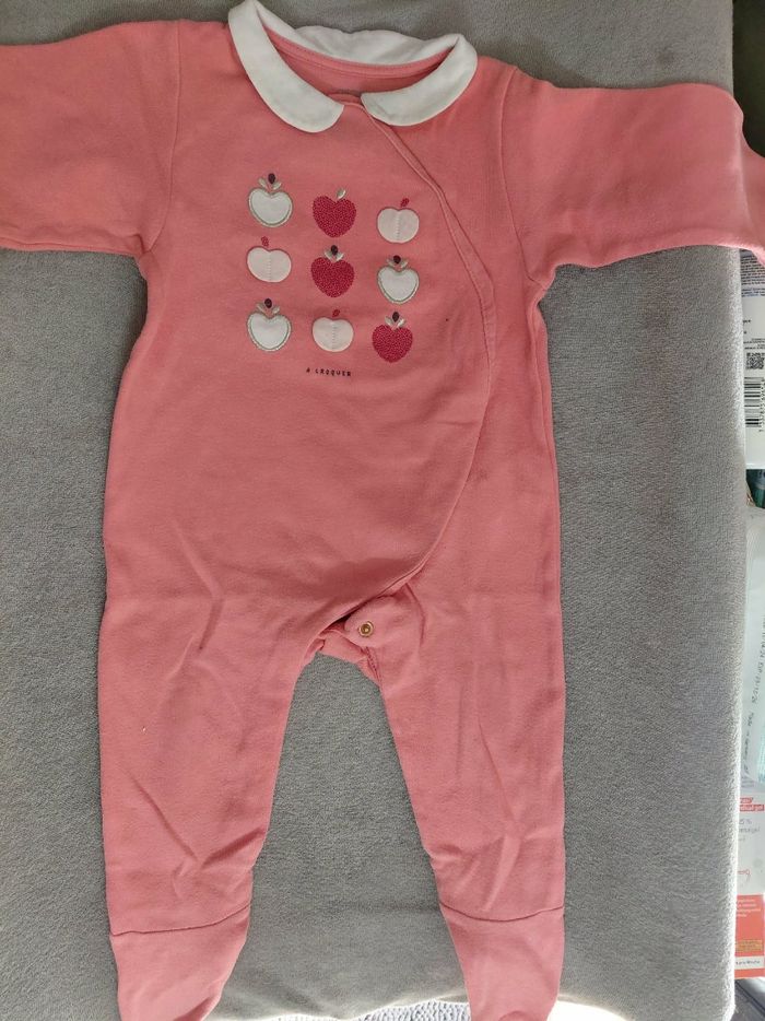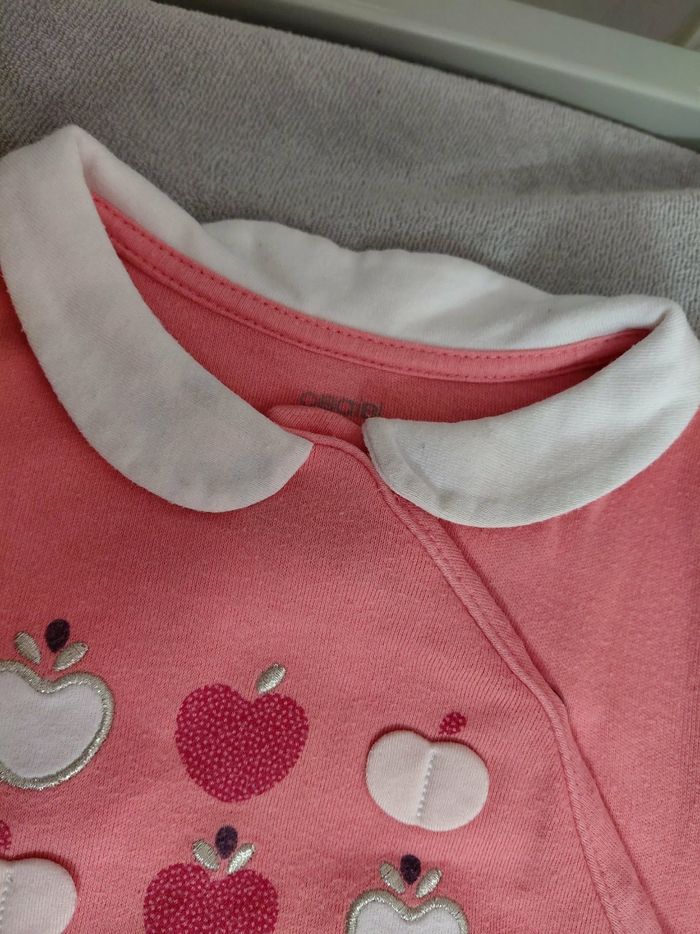Pyjama fin de marque obaïbi taille 12 mois. Une petite tache dans le tissus près des pommes qui était déjà sur le pyjama lors de l'achat ainsi que quelques petites taches sur le col.