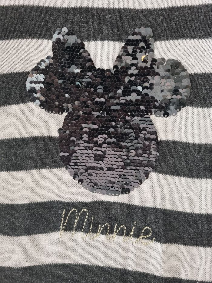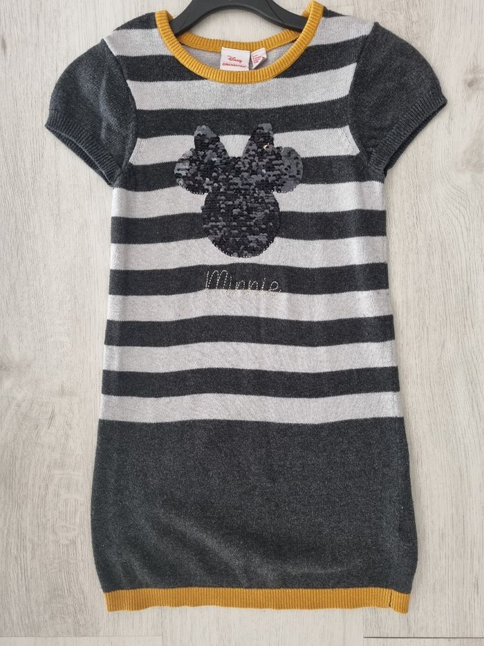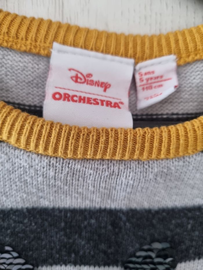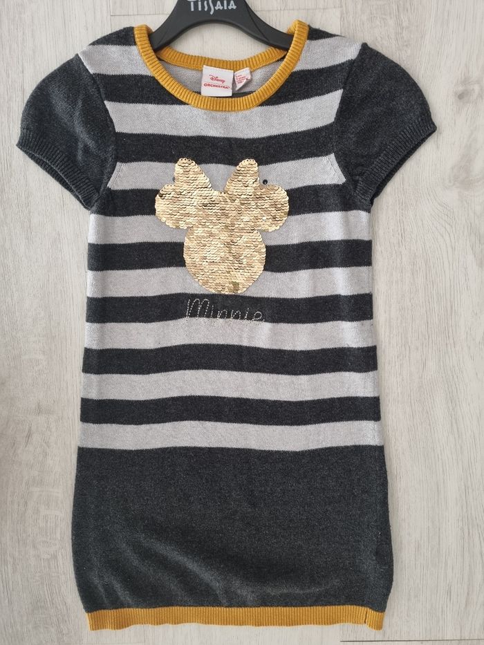 Joli robe pull minnie de marque orchestra taille 5 ans couleur gris a rayures et moutarde en excellent état. Avec sequins magiques.
