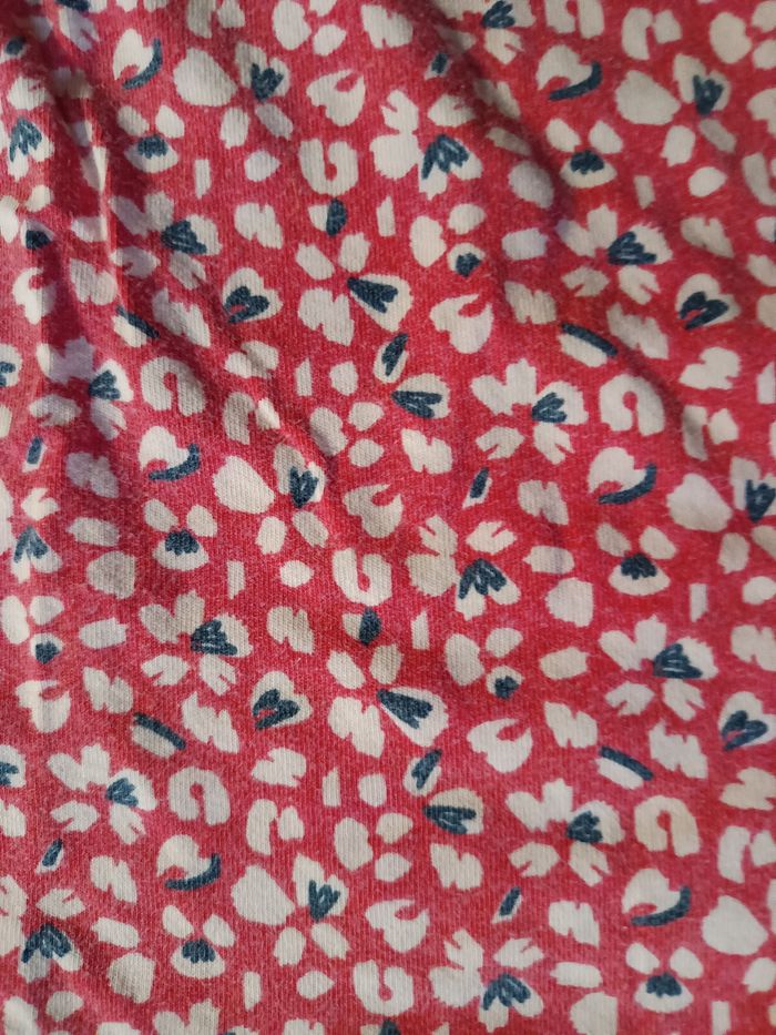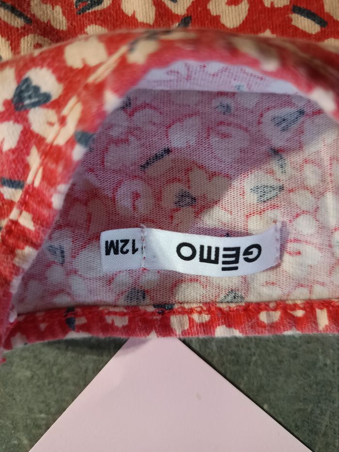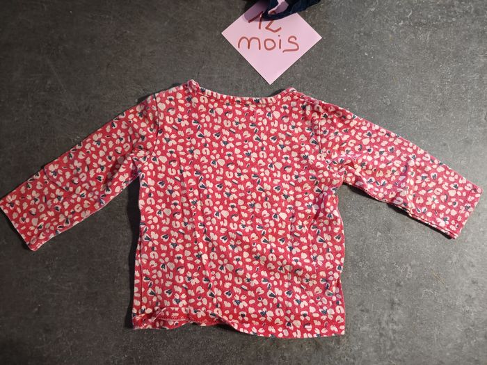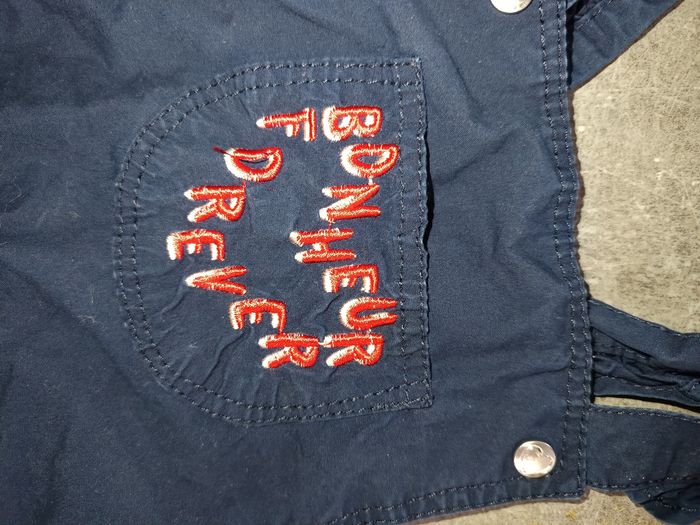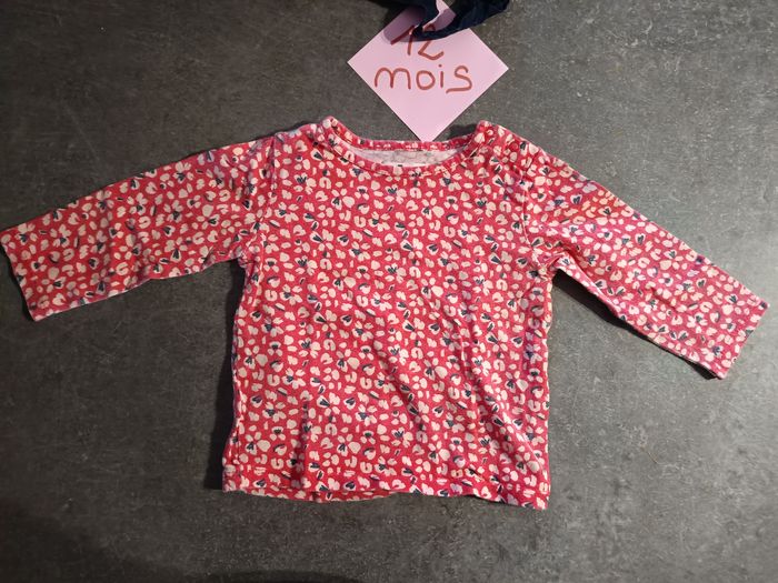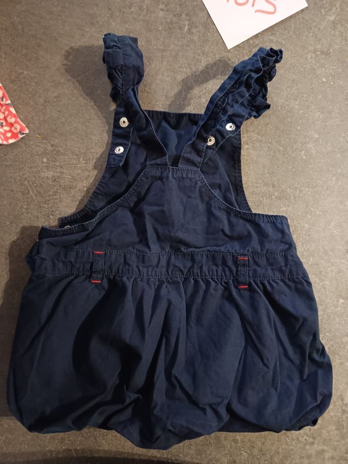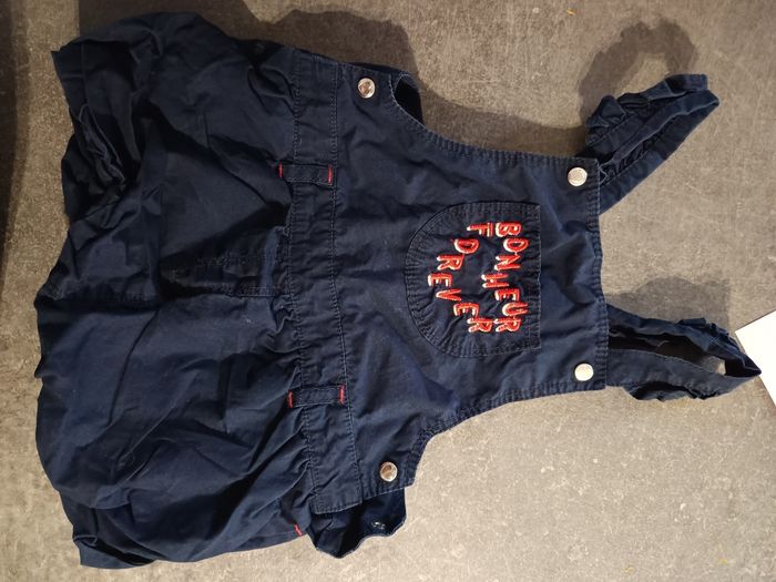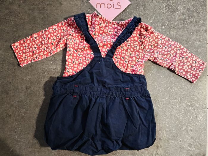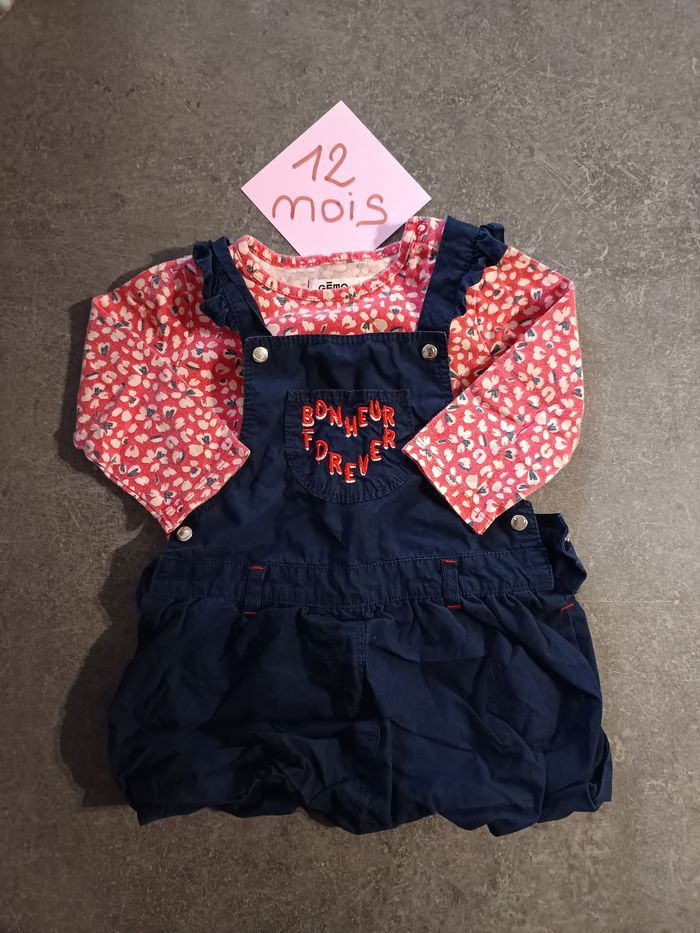 Ensemble 2 pièces : - 1 t-shirt manches longues rouges avec fleurs blanches et noires - 1 robe salopette bleue marine avec inscription en forme de coeur "bonheur forever" NEUF jamais porté ! Taille 12 mois