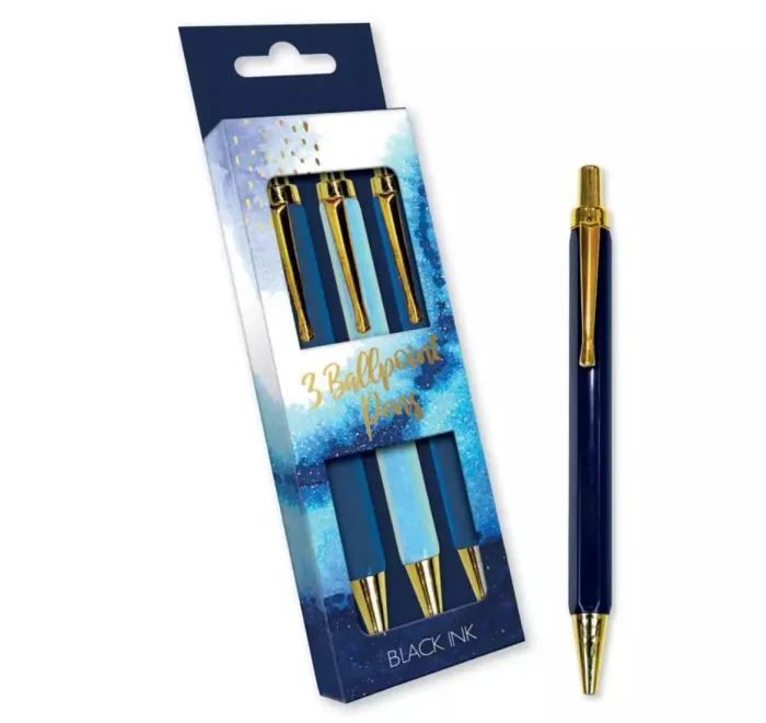 Lot de trois stylos à bille rétractables, tous avec encre noire. Appuyez sur le bouton pour faire sortir la mine et appuyez à nouveau pour la rentrer. Parfaits pour une écriture fluide et pratique, idéaux pour l’école, le bureau ou un usage quotidien.
