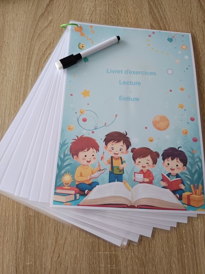 Livret d'exercices Montessori pour l'apprentissage de la lecture et de l'écriture. - Type de produit : Jeux éducatifs - Âge recommandé : De 4 à 6 ans + - Confectionner à la commande. - Pochette refermable fourni. Un excellent outil pédagogique pour aider les enfants à développer leurs compétences en lecture et en écriture. Contient 25 fiches plastifié contenant des exercices de lecture et d'écriture ( voyelles, consonnes, différents sons... ) D'autres activités sur mon profil .