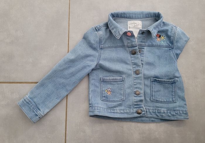 Veste en jean, de couleur bleu clair avec broderies sur poche et niveau épaule, de la Vertbaudet, taille 5 ans (110 cm), en très bon état. Article lavé pour la vente.