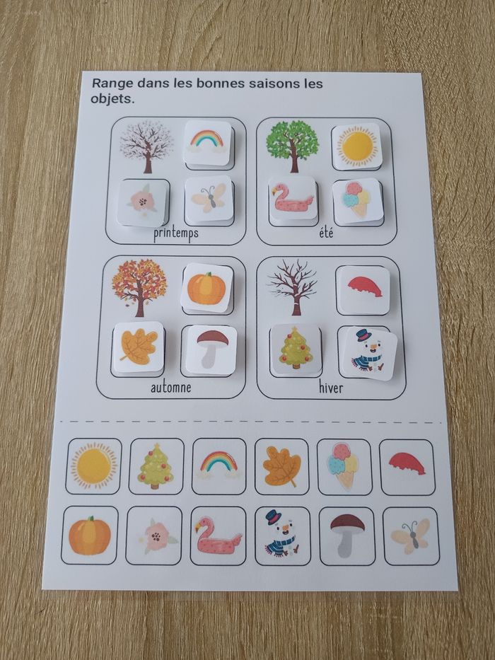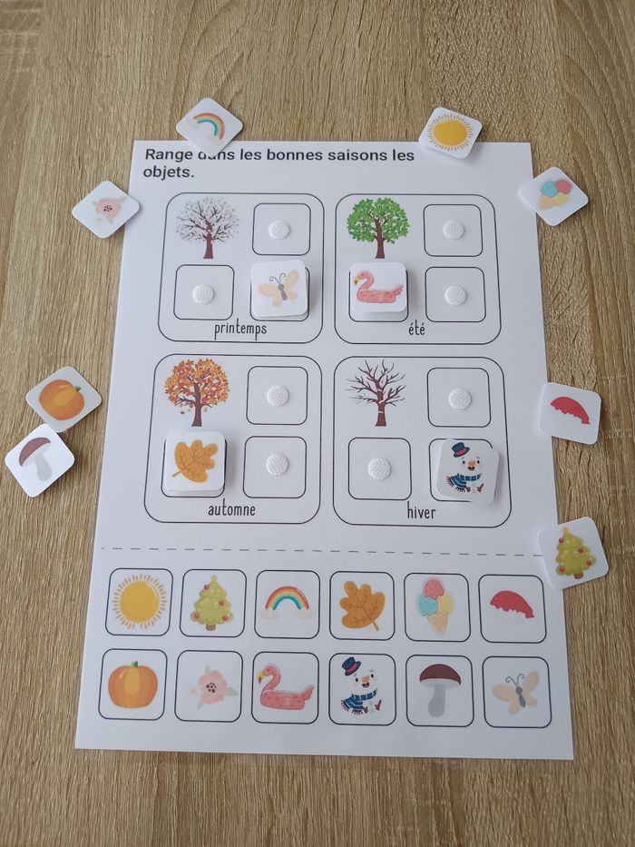 Jeu éducatif Montessori sur les saisons. - Type de produit : Jeux éducatifs - Âge recommandé : De 3 à 6 ans +. - Thème : Les saisons - confectionner à la commande. - pochette refermable fourni. But du jeu replace les objets dans les bonnes saisons. D'autres activités sur mon profil. N'hésitez pas à me contacter pour plus d'informations !