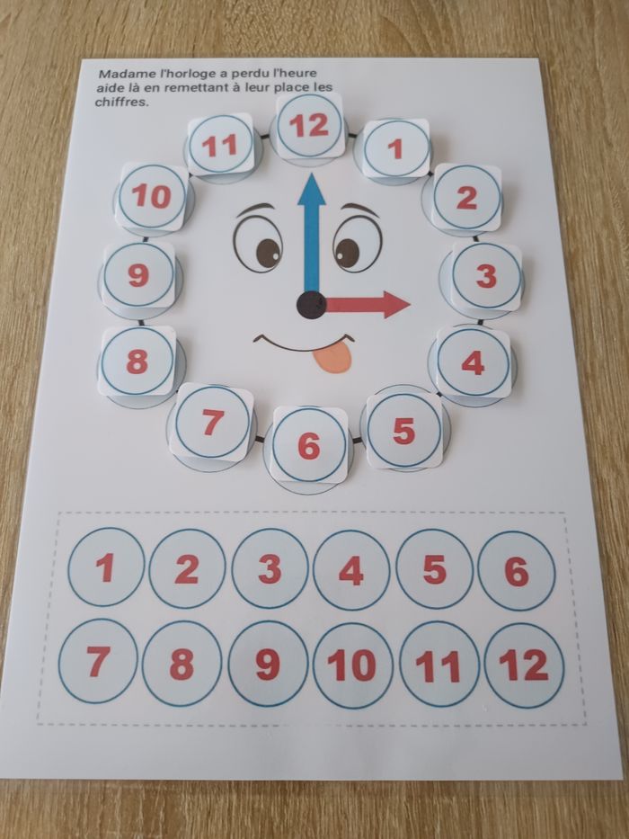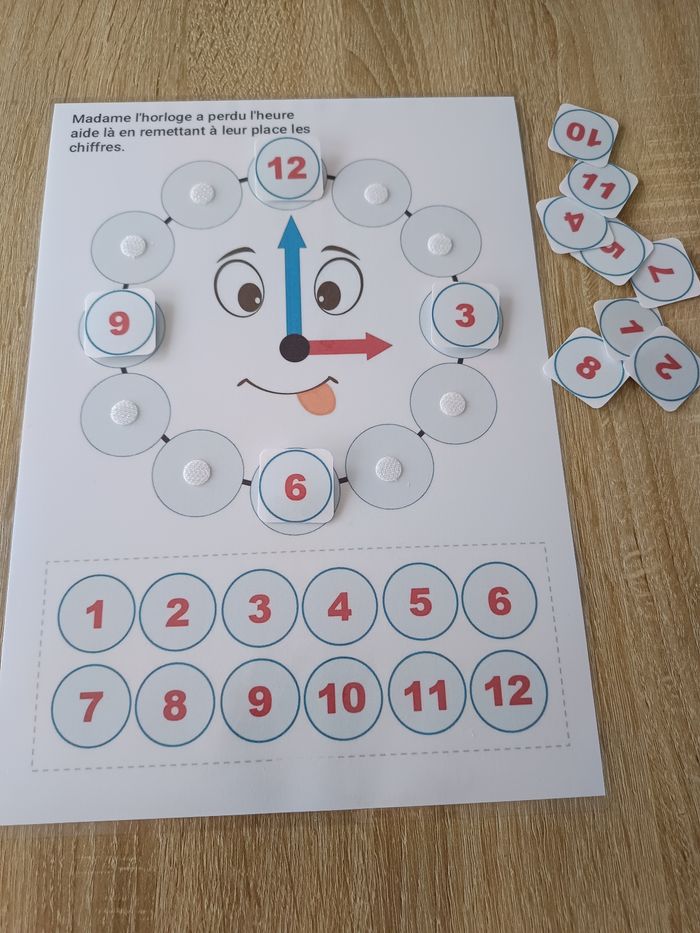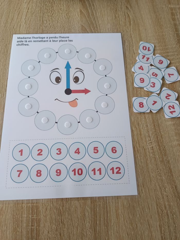 Fiche éducative Montessori sur l'horloge pour apprendre l'heure aux enfants. But du jeu replace les chiffres au bonne endroit. - Type de produit : Jeux éducatifs - Âge recommandé : De 4 à 6 ans - Fonctionnalités : Apprendre à lire l'heure, chiffres amovibles - Confectionner à la commande - Pochette refermable fourni. Un excellent outil pédagogique pour les tout-petits ! D'autres activités sur mon profil.