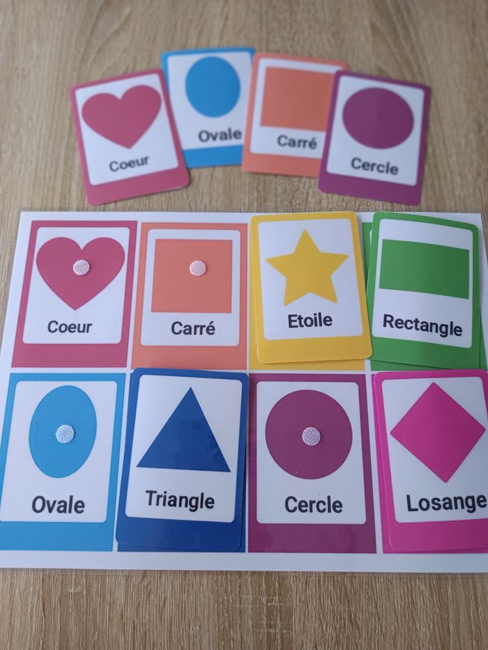 Jeu éducatif Montessori sur les formes géométriques. - Type de produit : Jouets d'éveil - Âge recommandé : De 0 à 3 ans et +. - Composition du lot : 8 cartes avec différentes formes géométriques (cœur, carré, étoile, rectangle, ovale, triangle, cercle, losange) - Fonctionnalités : Apprentissage des formes, des couleurs et de la reconnaissance des symboles - Confectionner à la commande. - Pochette refermable fourni. Un excellent outil d'apprentissage pour les petits . D'autres activités sur mon profil.