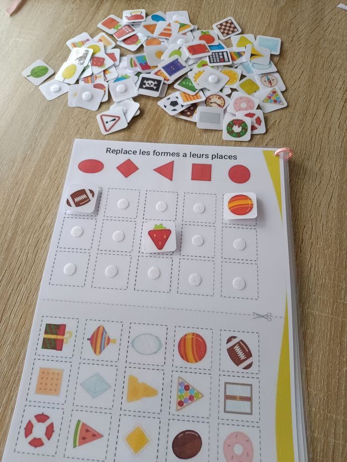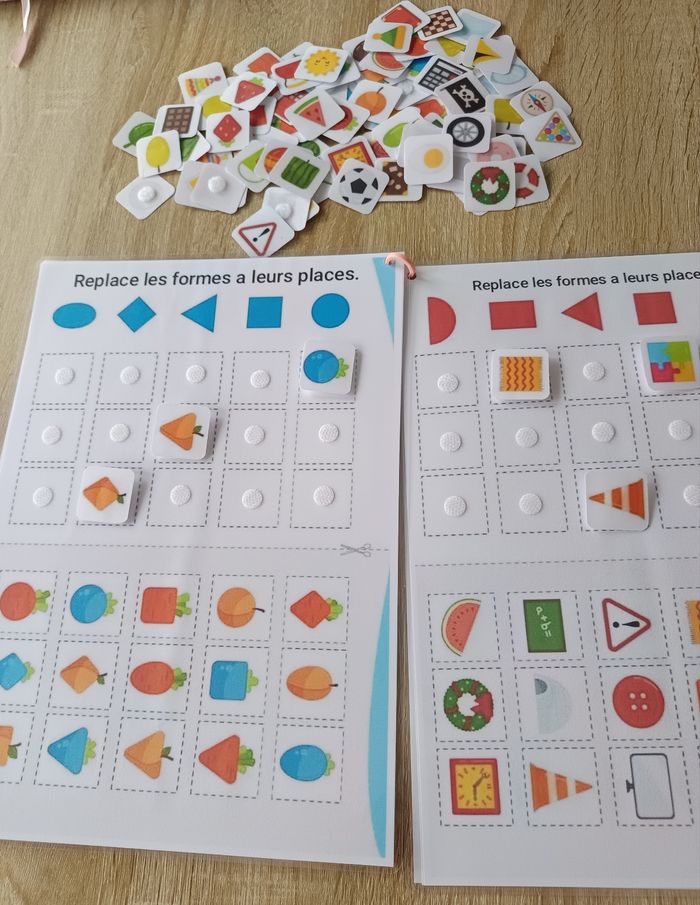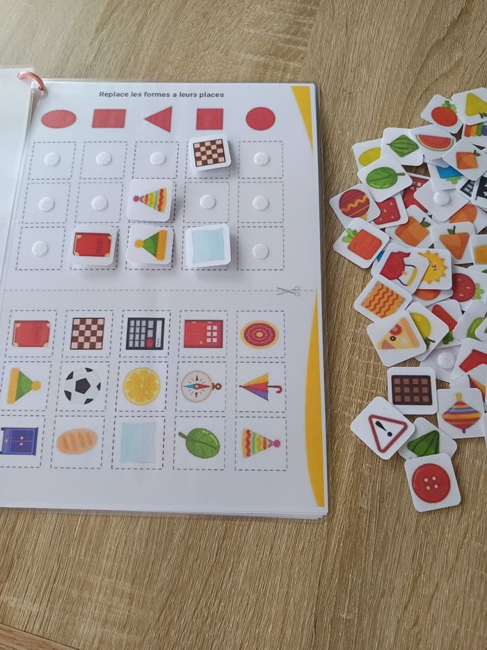 Livret de formes Montessori, un outil pédagogique idéal pour les enfants de 0 à 3 ans et plus. Permet de replacer les formes à leurs places - Livret de 6 fiches différentes. - Confectionner à la commande. - Pochette refermable fourni. D'autres activités sur mon profil .