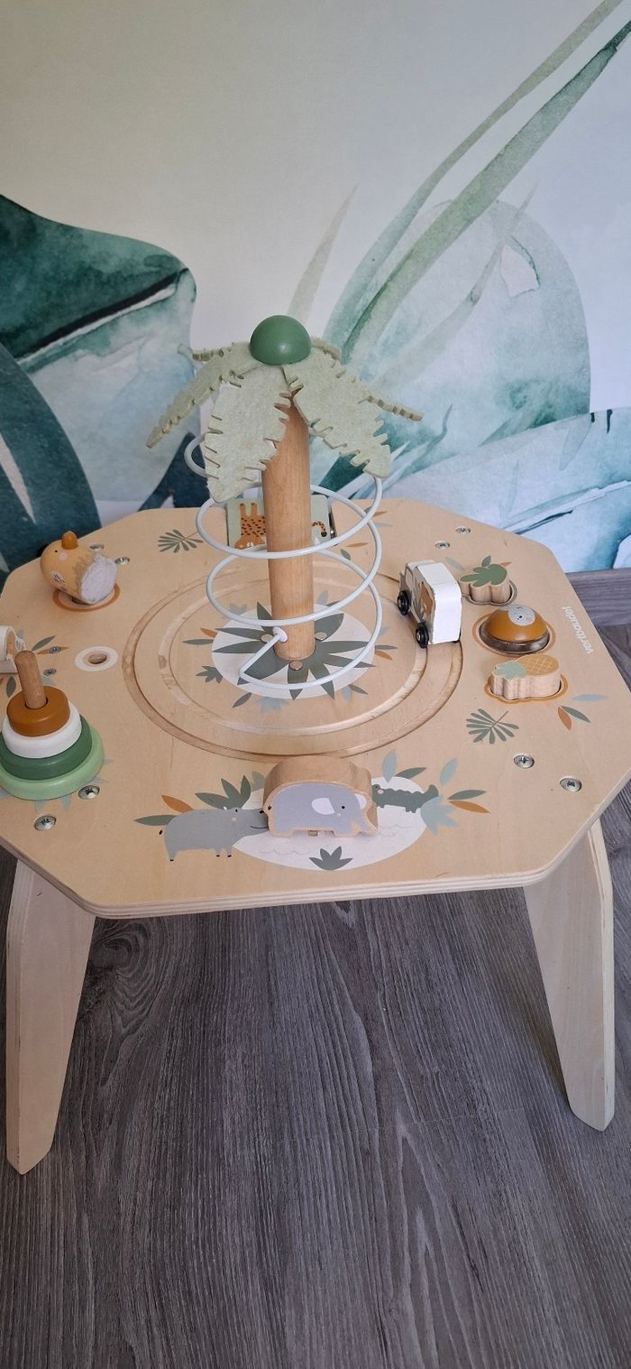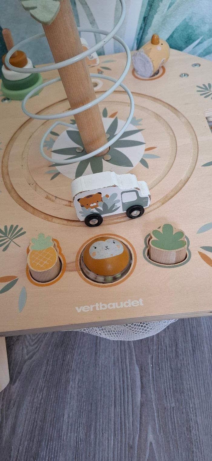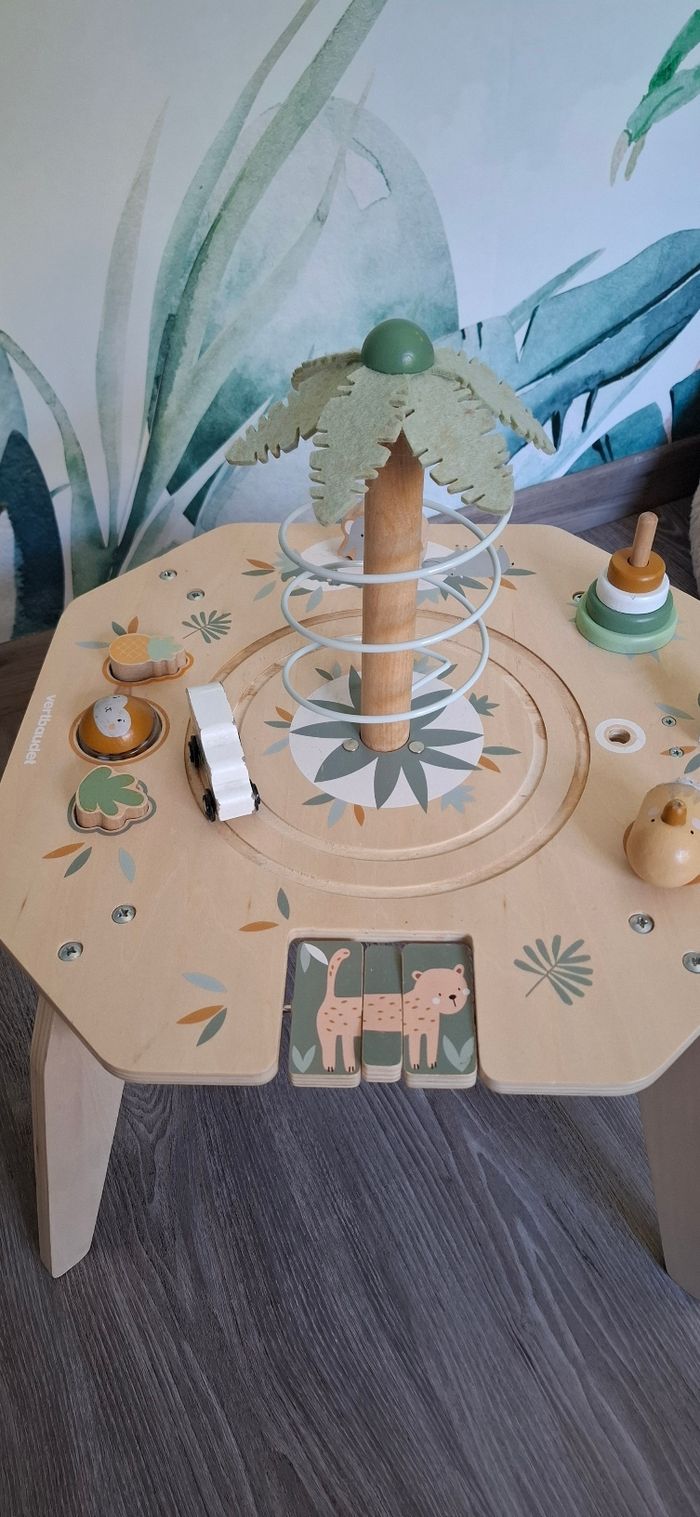 Table d’activités en bois thème Safari Vertbaudet Tendance et craquante, cette table d’éveil stimule la motricité fine, la coordination et l’équilibre. Bébé peut jouer debout en toute autonomie Activités : palmier avec toboggan à balle, camion safari qui tourne, encastrement de formes et boule à marteler, éléphant à visser, perroquet à faire voler, jeux à tourner et à manipuler, rangements intégrés ⚠️ Défauts : usure normale, manque de peinture par endroits, tête de tigre manquante, tige blanche du levier absente, quelques taches sur les feuilles du palmier (voir photos) Maison non fumeur Envoi rapide