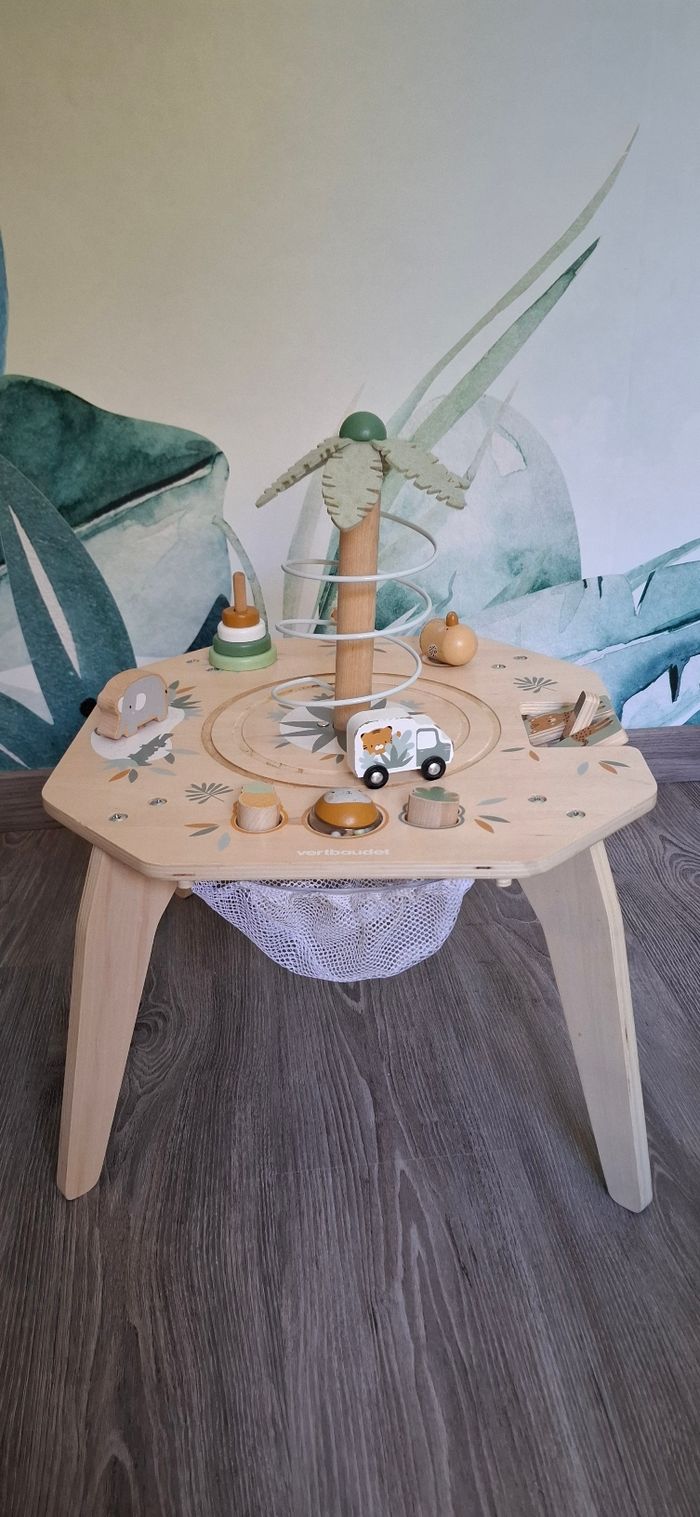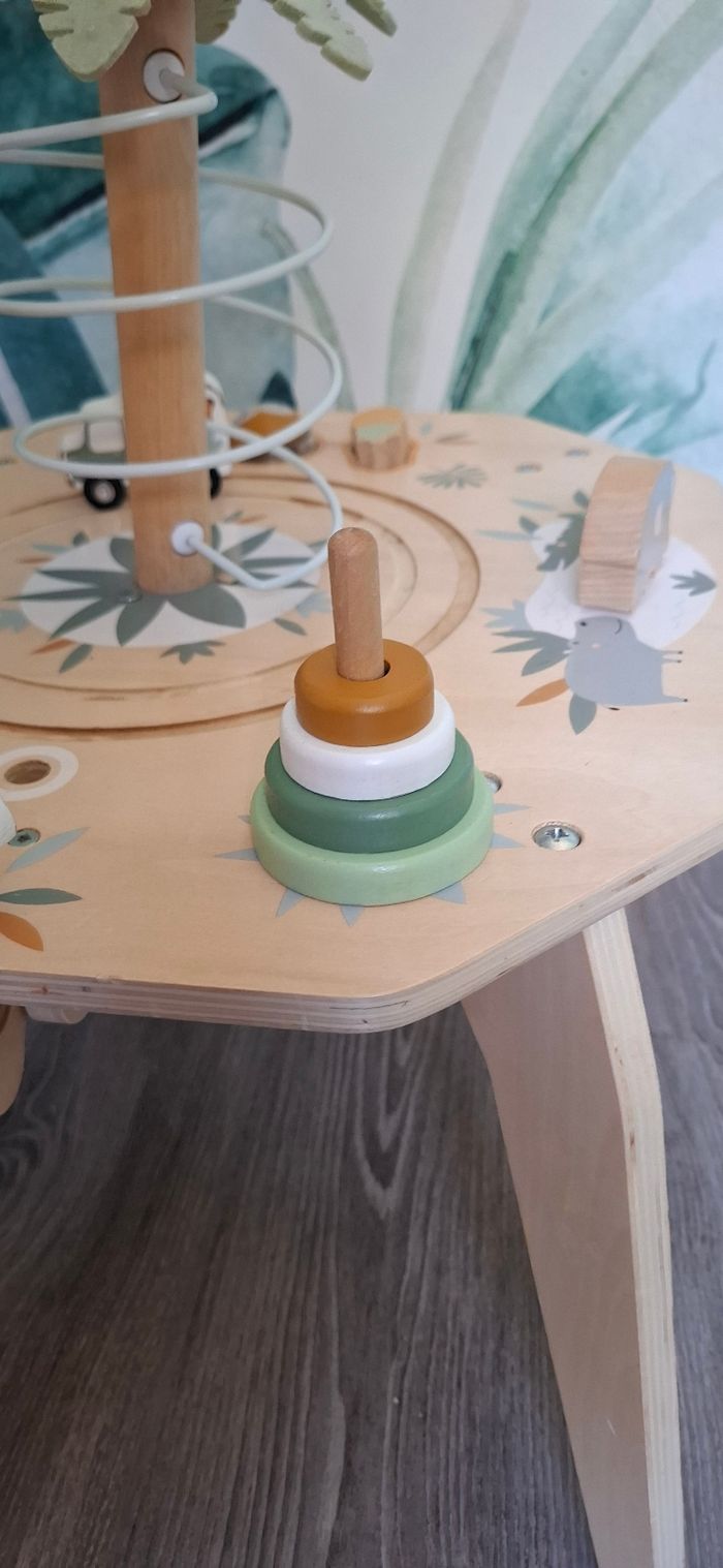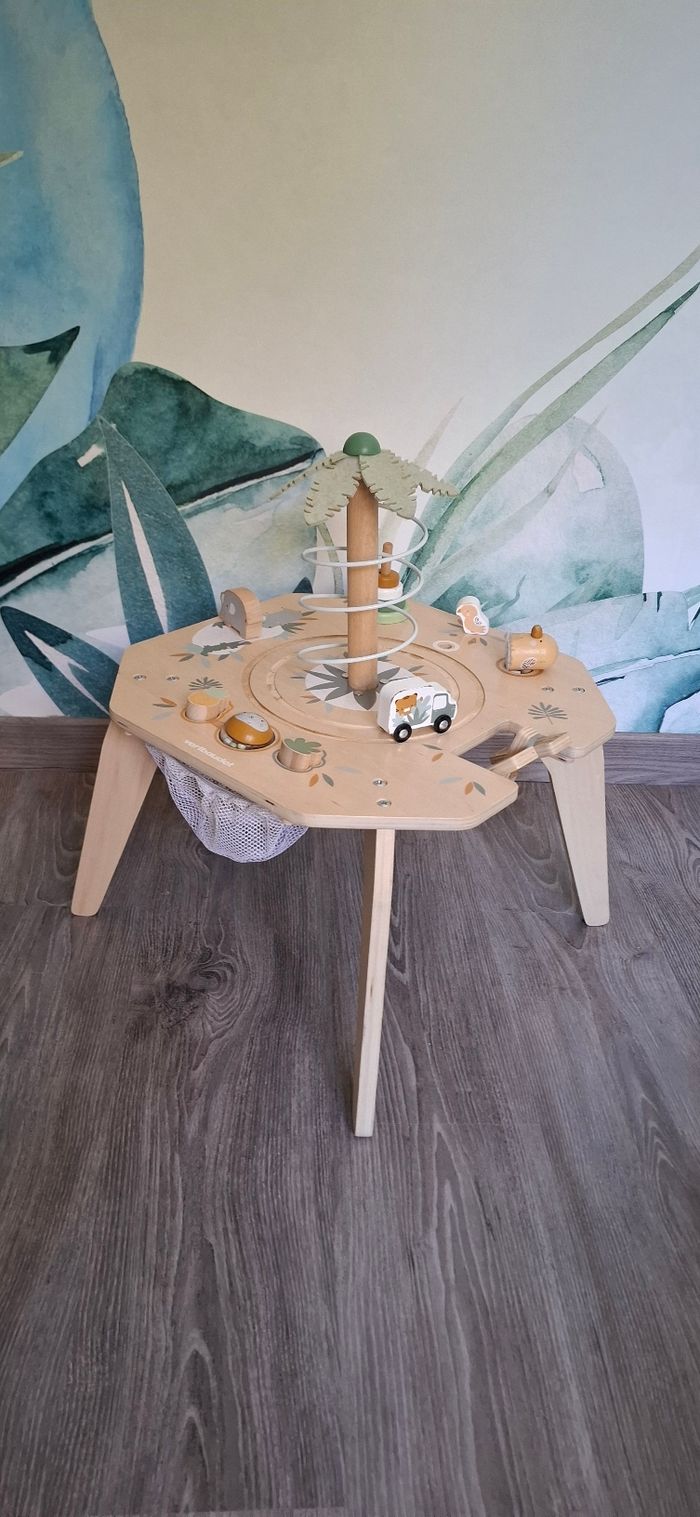 Table d’activités en bois thème Safari Vertbaudet Tendance et craquante, cette table d’éveil stimule la motricité fine, la coordination et l’équilibre. Bébé peut jouer debout en toute autonomie Activités : palmier avec toboggan à balle, camion safari qui tourne, encastrement de formes et boule à marteler, éléphant à visser, perroquet à faire voler, jeux à tourner et à manipuler, rangements intégrés ⚠️ Défauts : usure normale, manque de peinture par endroits, tête de tigre manquante, tige blanche du levier absente, quelques taches sur les feuilles du palmier (voir photos) Maison non fumeur Envoi rapide