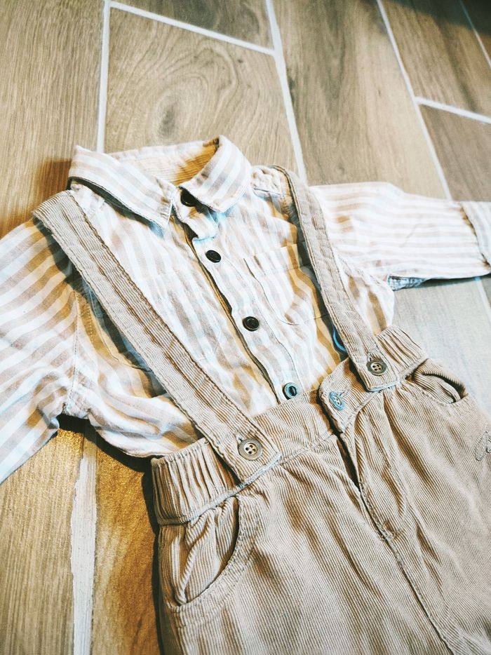 🧒🏻Bouchara - Ensemble Pantalon velours beige avec bretelles et chemise à carreaux - Taille 6 mois - photo numéro 5