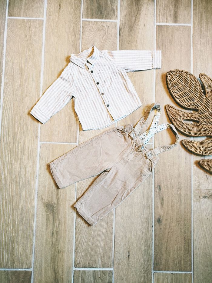 🧒🏻Bouchara - Ensemble Pantalon velours beige avec bretelles et chemise à carreaux - Taille 6 mois - photo numéro 1
