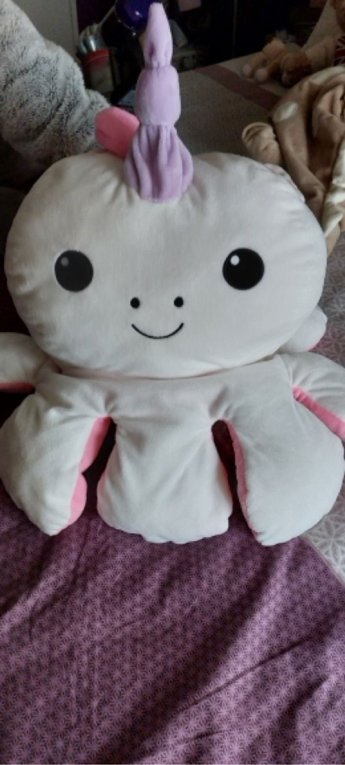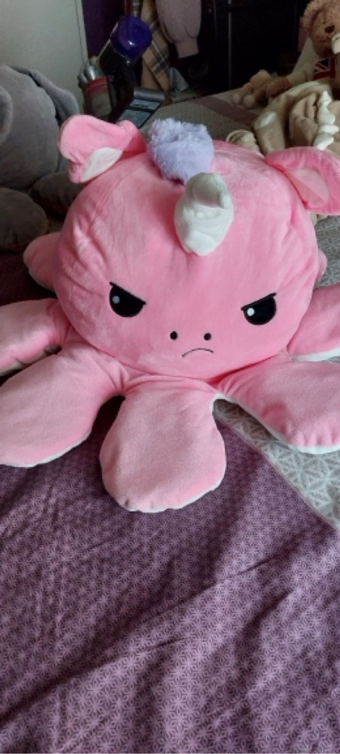 Peluche licorne réversible pour laisser apparaître la joie ou la colère. Il n’y a ni tâche ni accroc.