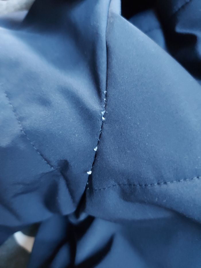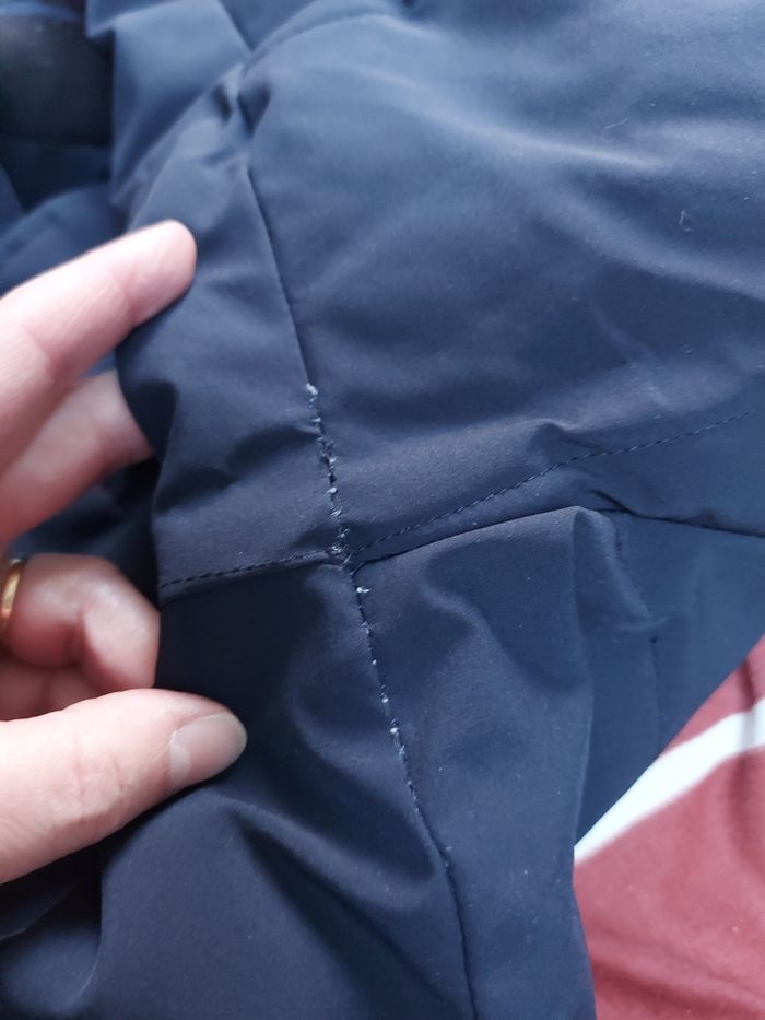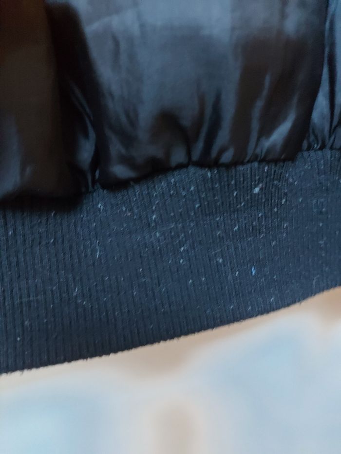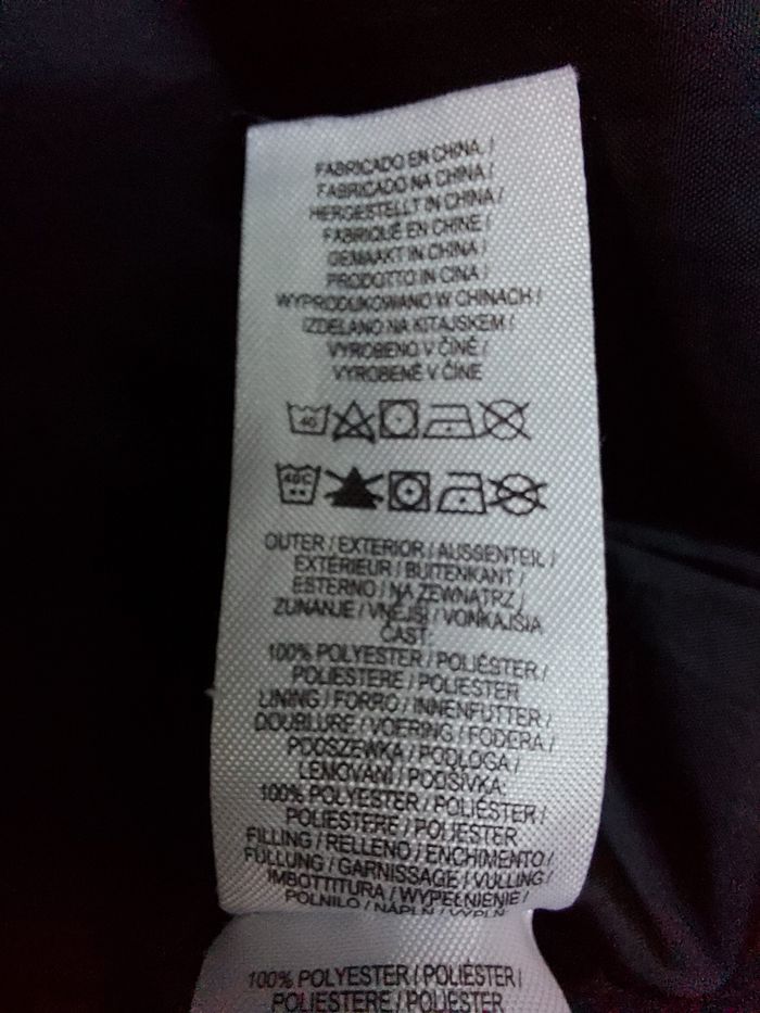 Taille normalement. Portée souvent. Coutures reprises sous les manches. Bouloches sur les élastiques. Traces de frottement sur les poches. 100% Polyester