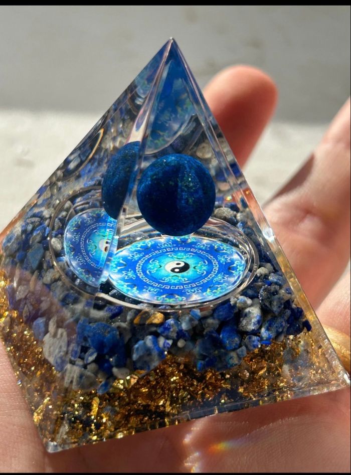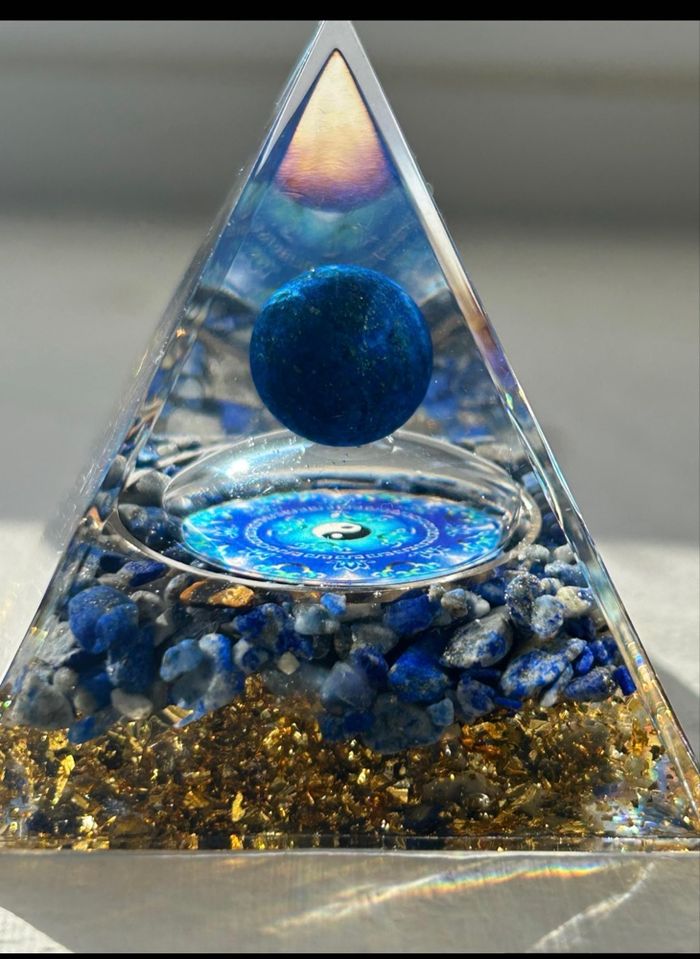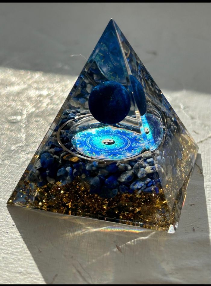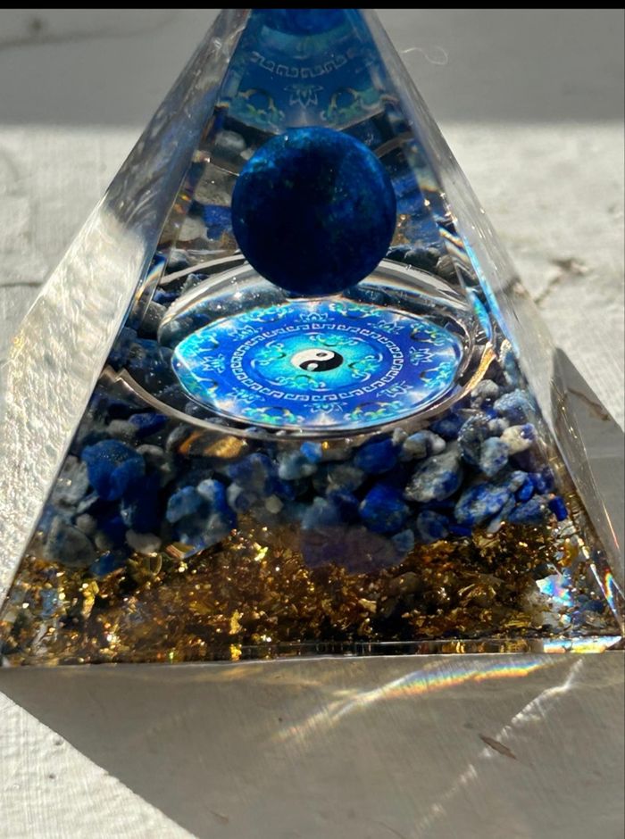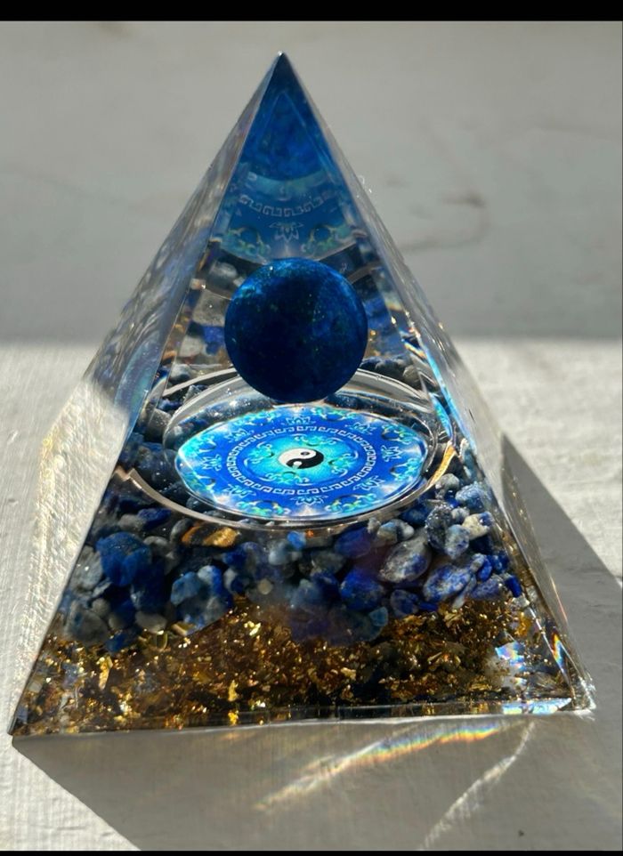 Pyramide orgonite artisanale intégrant des éclats de lapis-lazuli naturel, des inclusions métalliques dorées et un symbole Yin & Yang au centre, représentant l’équilibre et l’harmonie des énergies. Sa forme pyramidale est reconnue pour favoriser la circulation et l’amplification énergétique.