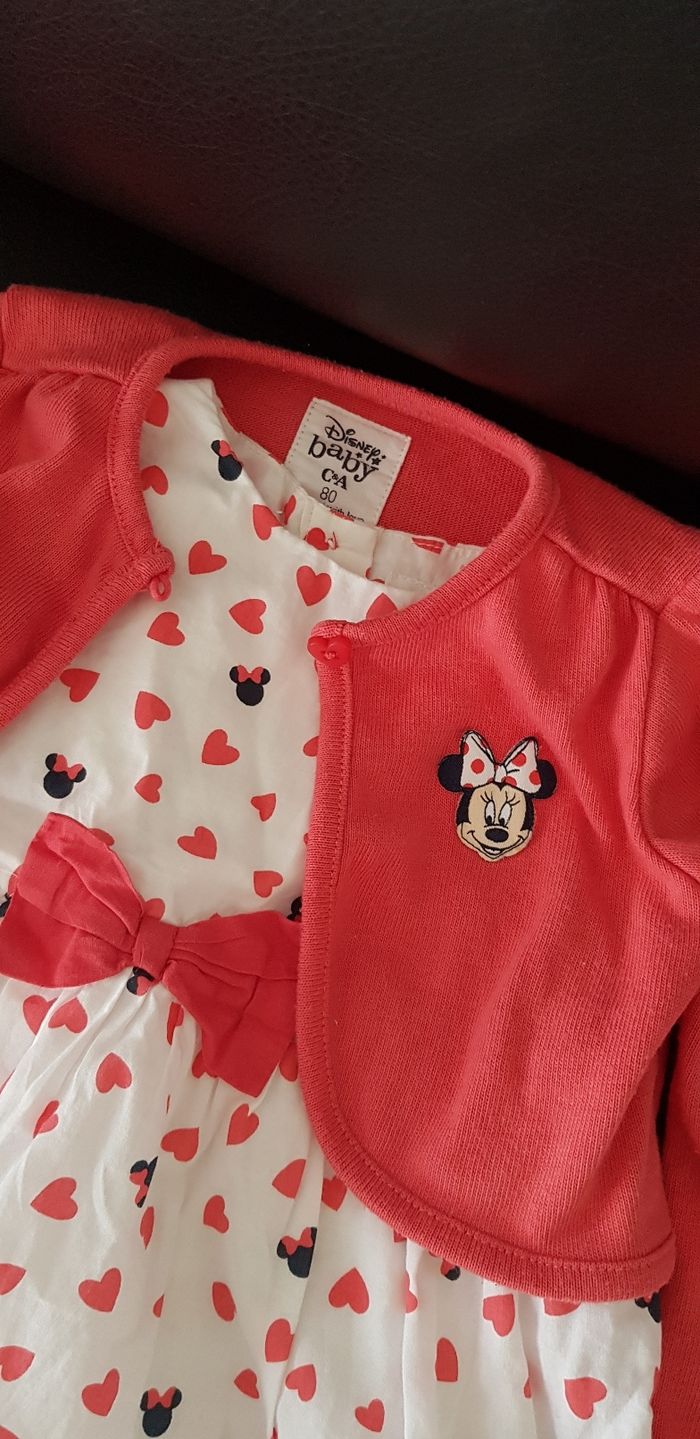 Ensemble composé de la robe et de son gilet. Le gilet est un peu moins foncé que sur la photo. Il a un motif minnie. La robe est blanche et a des imprimée de tête de minnie et d'un noeud de la même couleur que le gilet.