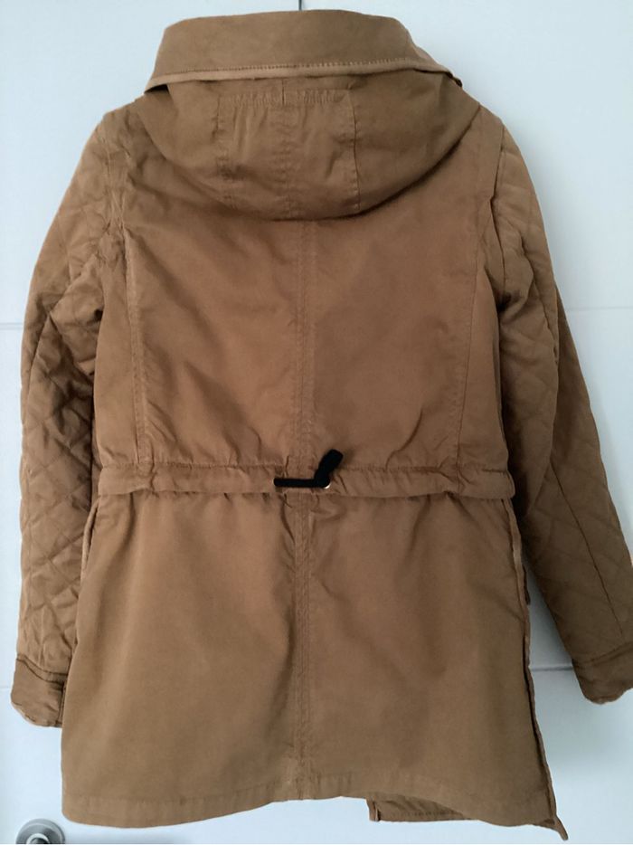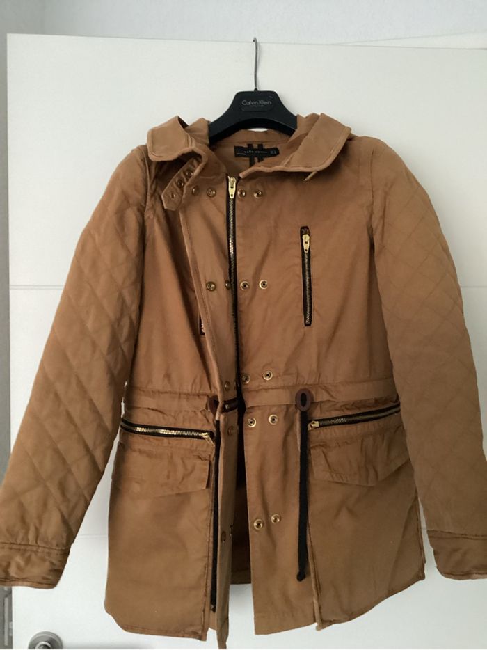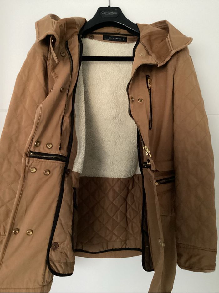 Parka femme 3 en 1 ZARA taille S avec capuche, manches matelassées , 4 poches plaquées devant avec un gilet sans manches imitation faux mouton et matelassé avec poche intérieure qui peut se boutonner à l’intérieur de la parka + un blouson court. Couleur camel . 100% polyester.