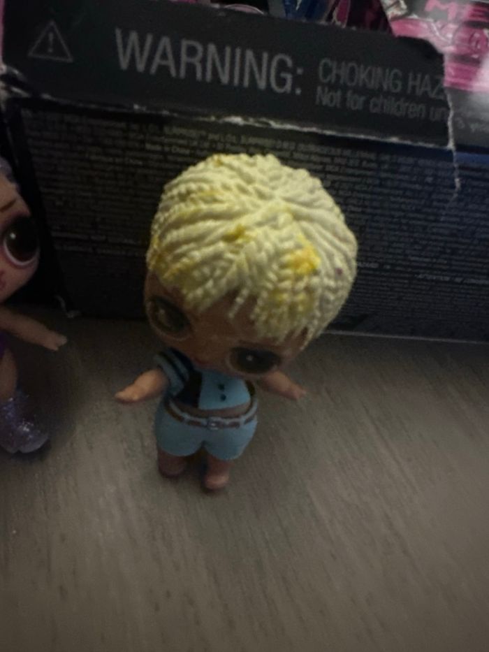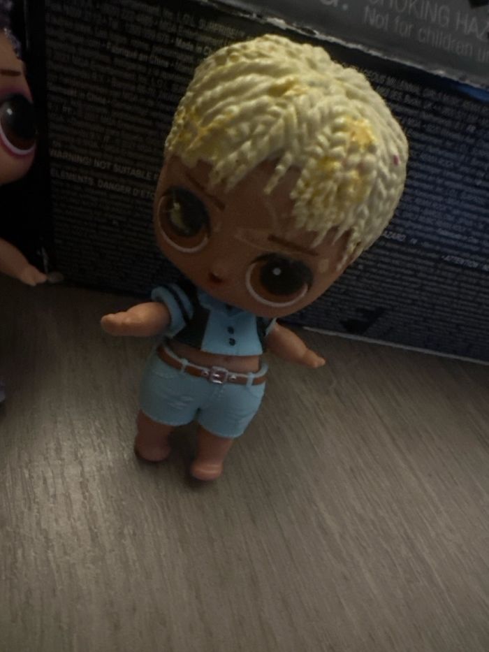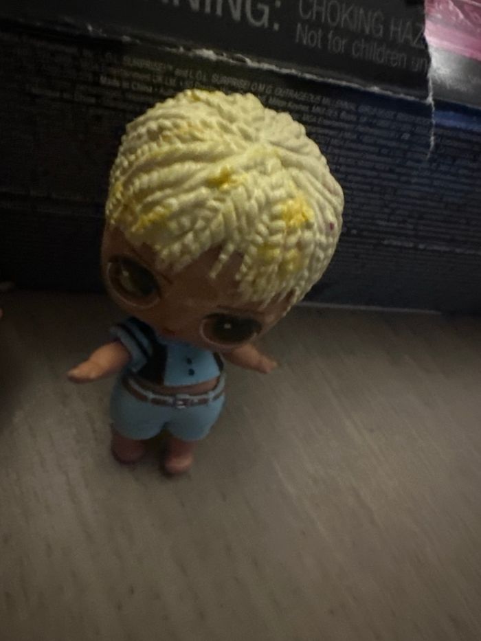 Je vends une mini poupée LOL Surprise (personnage garçon). La vente comprend : – la poupée – sa tenue bleue Vendue seule, sans accessoires ni boîte. État correct : poupée déjà utilisée, cheveux marqués et petite trace visible sur un œil (voir photo). Idéale pour compléter une collection LOL ou pour le jeu. Prix : 5e Remise en main propre possible ou envoi à vos frais.