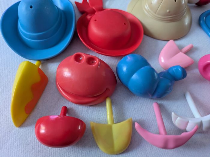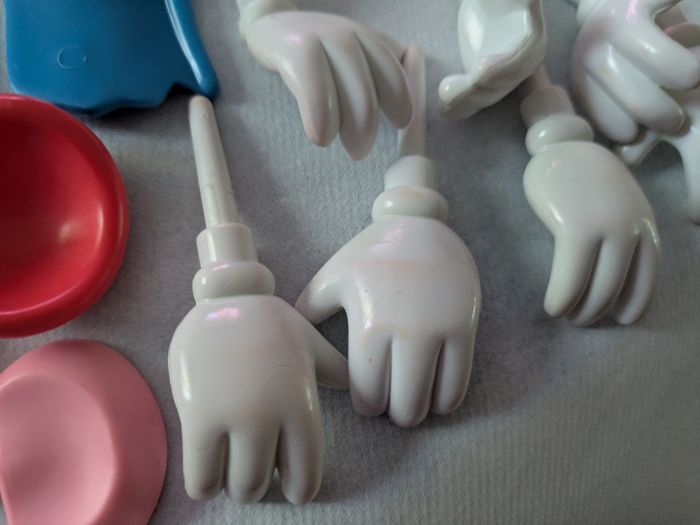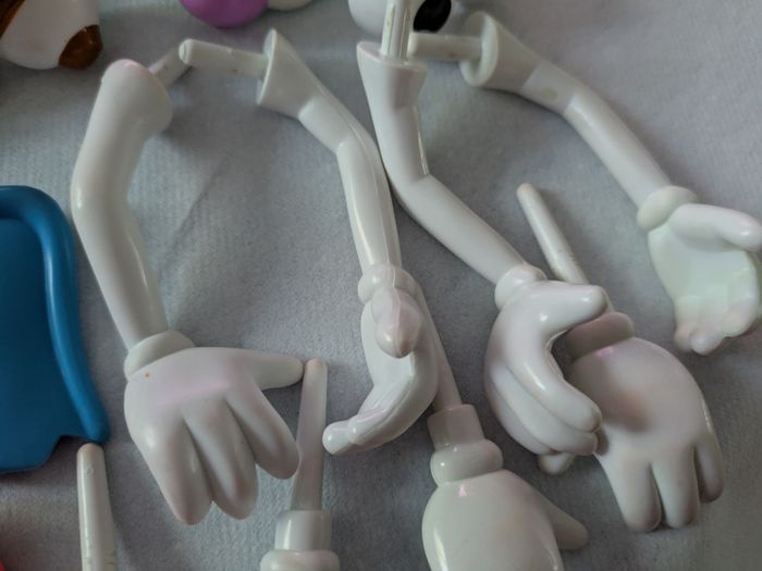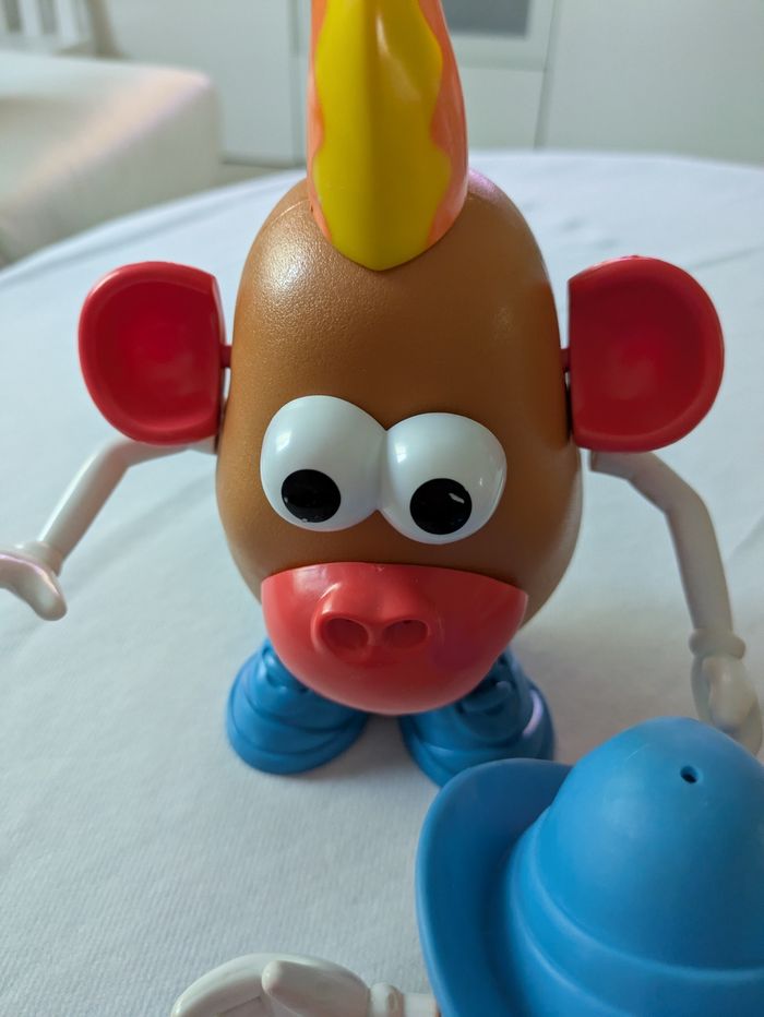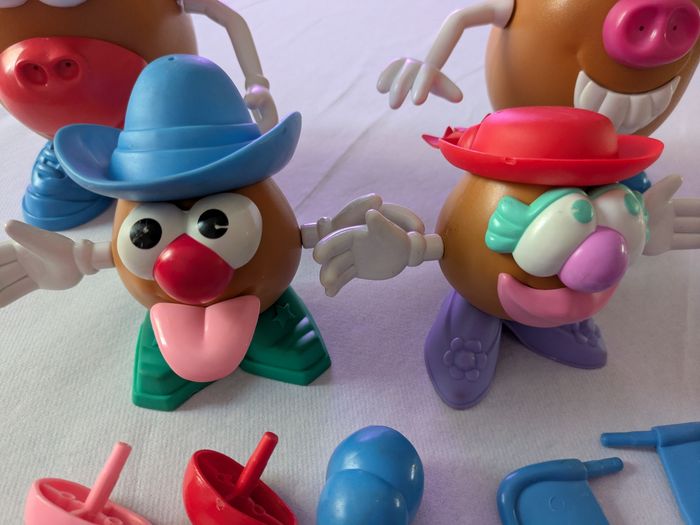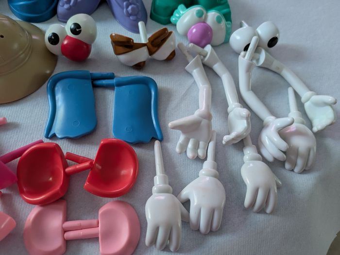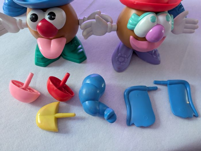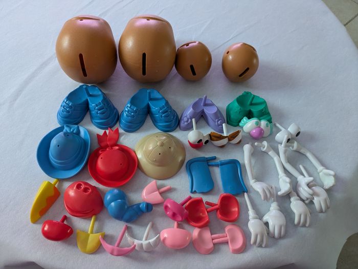 Il y a 2 grosses patates dans lesquelles on range les petits accessoires et 2 petites avec de nombreux accessoires en bon état mais certains un peu effacés ( yeux ) et il y a des traces un peu rouges sur bras et mains ( voir photos ).