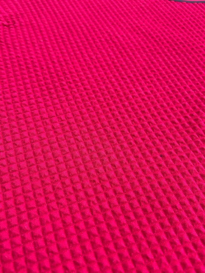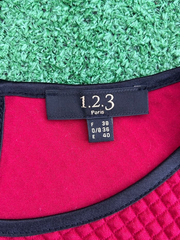 Top rouge à manches courtes de la marque 1.2.3 Paris, matière effet relief losanges, très chic porté avec un jean ou une jupe. Hauteur environ 60 cm, largeur à plat sous aisselles environ 48 cm, convient pour une taille 38 femme. Finitions contrastées noires au col, aux manches et à la base, petite ouverture goutte d’eau au dos avec bouton, très bon état général. 68% polyester, 29% viscoses, 2% elasthane.
