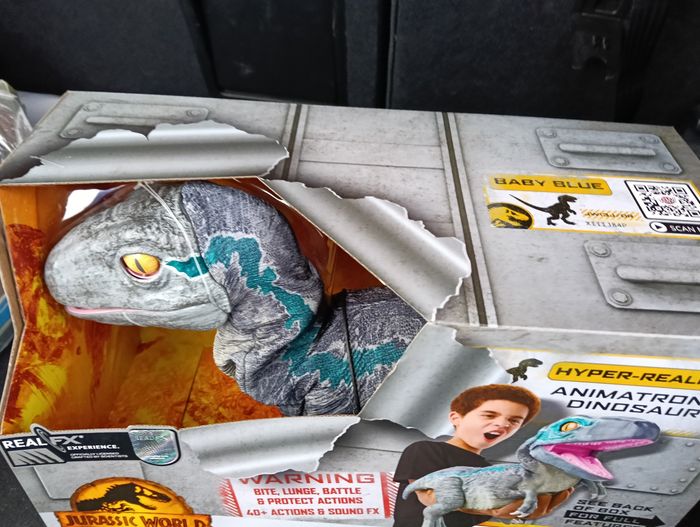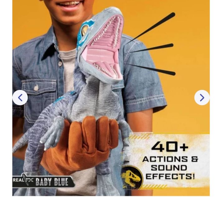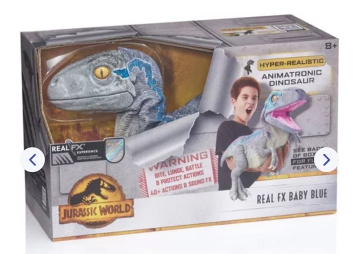 Real FX Baby Blue est un dinosaure animatronique hyperréaliste. Action de morsure, d’attaque, de combat et de protection. Plus de 20 effets sonores du film. Baby Blue a la taille exacte du film et c’est un ‘véritable’ bébé dinosaure dont vous pourrez vous occuper et prendre soin. 20 sons déclenchés par le mouvement et le toucher de Baby Blue ! Ainsi que des sons bonus cachés. Inclus : gant Ranger non amovible et bébé dinosaure Baby Blue, équipé d’une poignée de pistolet interne et d’un système de contrôle par gâchette ! Nécessite 3 piles LR03 (AAA) non incluses. Ultra - réaliste. Prenez en soin et il deviendra votre animal de compagnie et votre protecteur pour la vie ! Simple à utiliser. Glissez votre main dans le gant Ranger et le système de poignée-pistolet avec gâchette permet de contrôler les actions de Baby Blue, y compris les morsures, les attaques, les inclinaisons de la tête, les grognements et même les clignements d’yeux ! Instructions incluses (en Français, allemand, anglais, et espagnol).