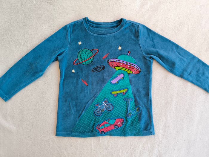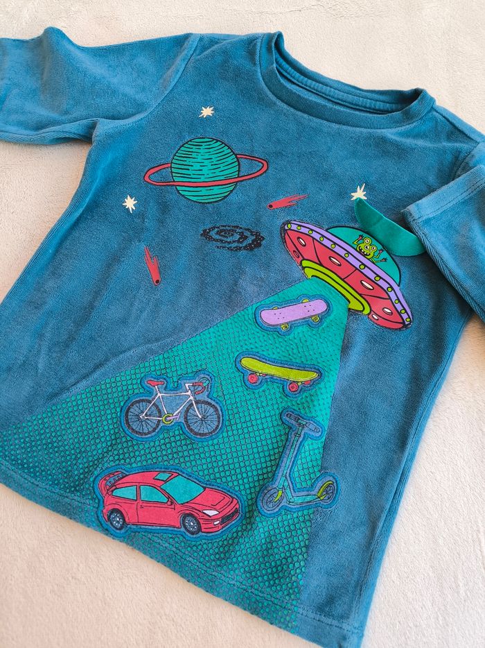 Pyjama deux pièces Marque Sergent Major Taille 6 ans, 116 cm Haut : • Coloris bleu, vert, rouge • Manches longues • Thème espace : imprimés planètes, soucoupe volante, skateboard, vélo, trotinette, voiture • Velours, doux • Imprimé légèrement abîmé, filet intérieur enlevé Pantalon : • Coloris bleu • Motifs étoiles • Taille élastique • Velours, doux • Point de couture fait sur le haut du pantalon En bon état #evelyne_garcons_6ans #evelyne_garcons