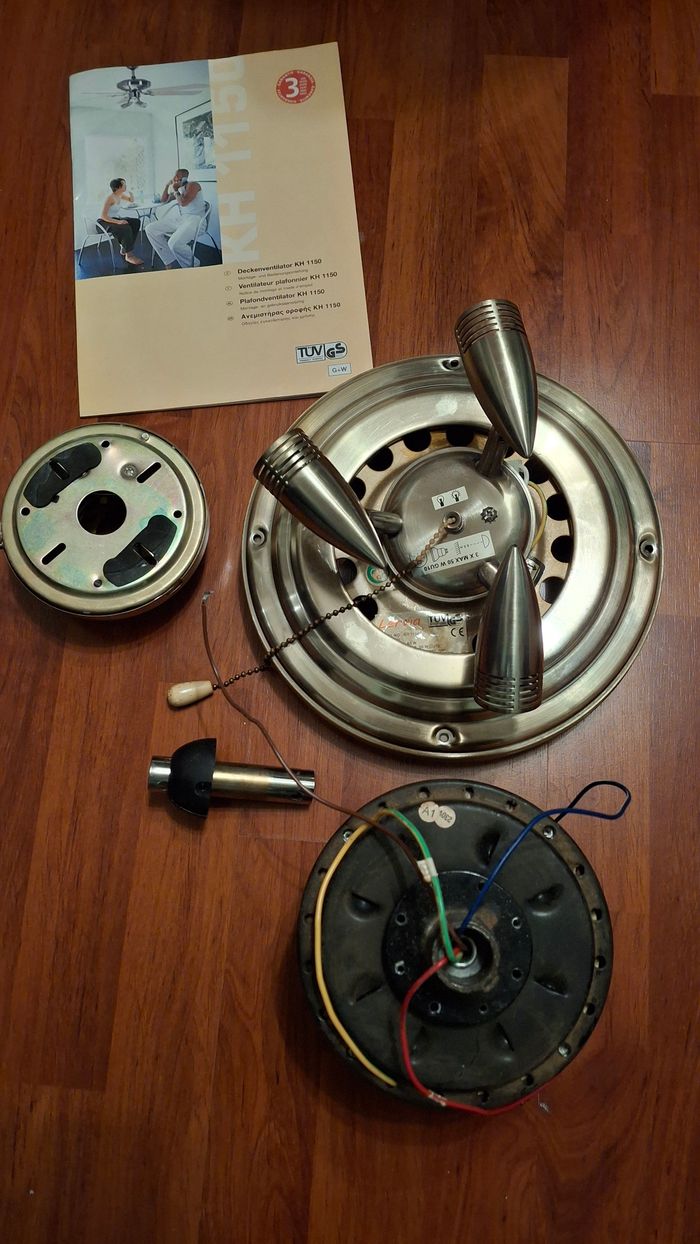 Le métal s'est encrassé à l'extérieur avec le temps, et les hélices ont jauni (nettoyable). Tout fonctionne.
