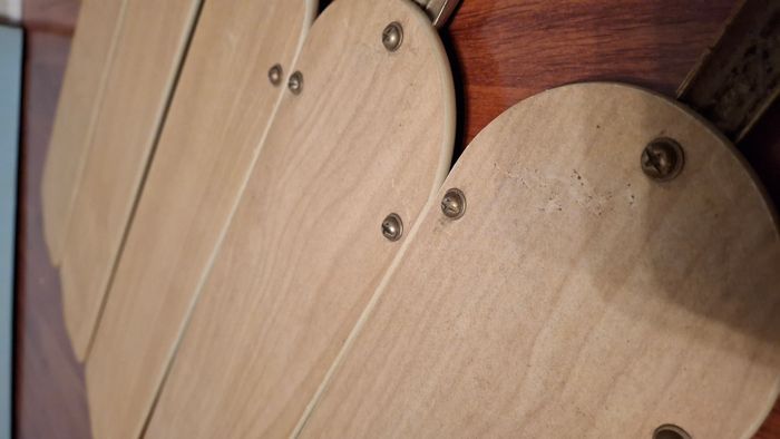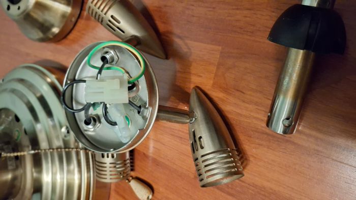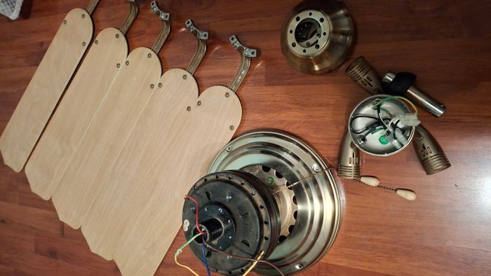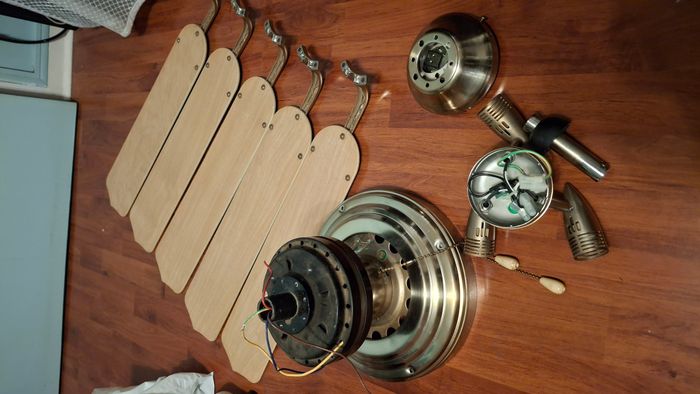 Le ventilateur possède 3 vitesses, les hélices possèdent un côté bois et un côté blanc-écru peint.