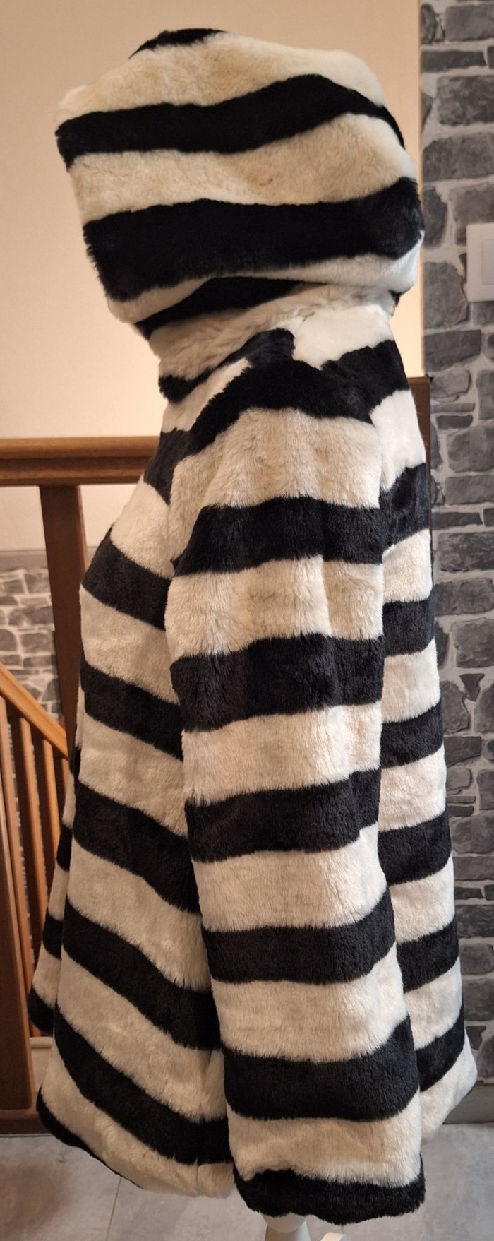 Manteau chaud, fourrure rayée d'un côté, matière imperméable de l'autre. A capuche. Zippé. Deux poches. En acrilyque, polyester, coton et polyamide.