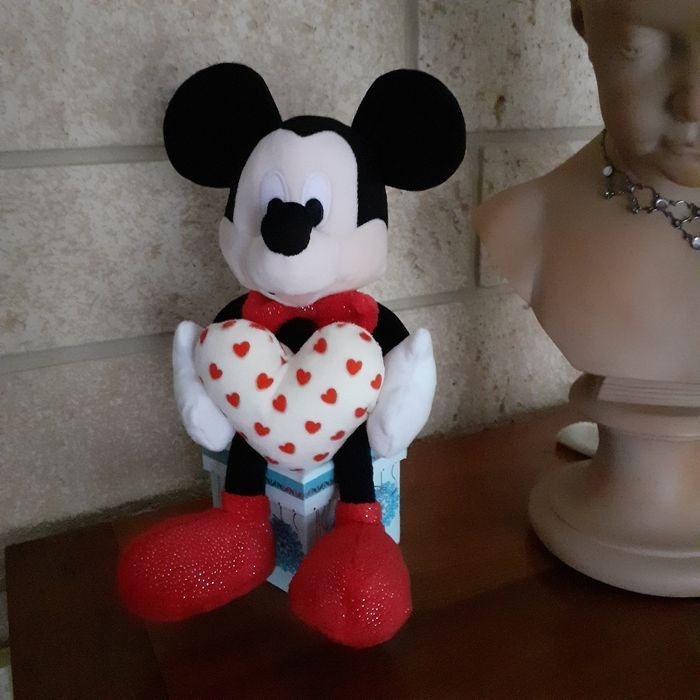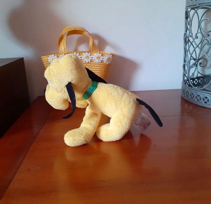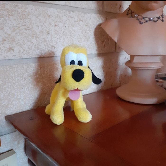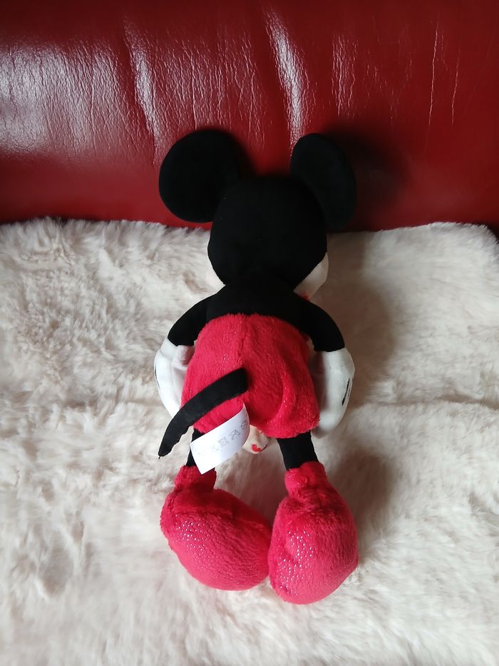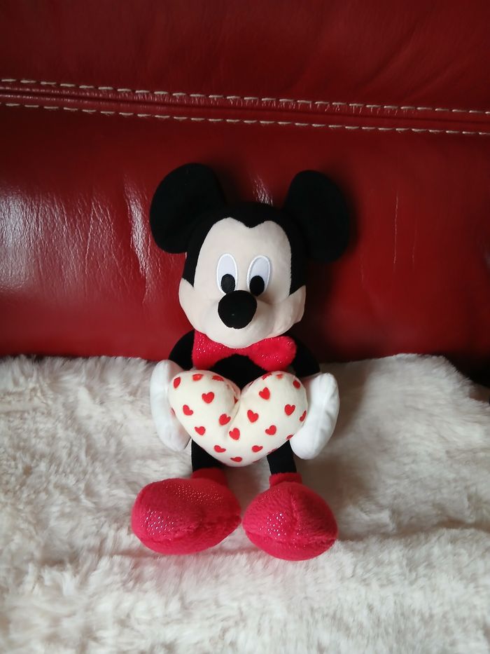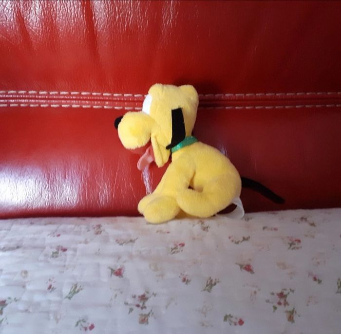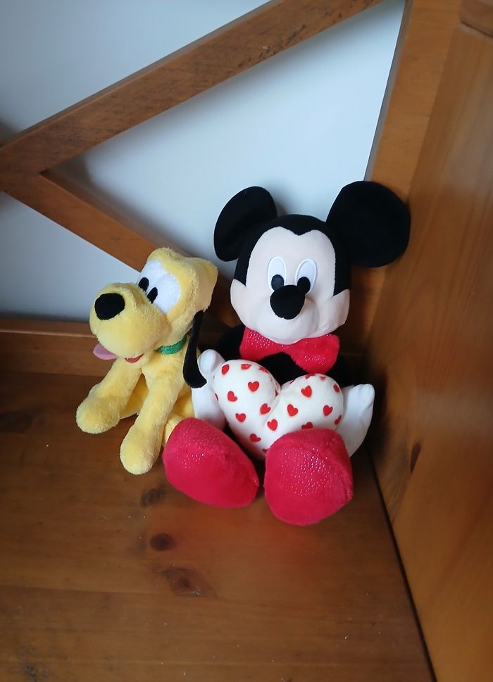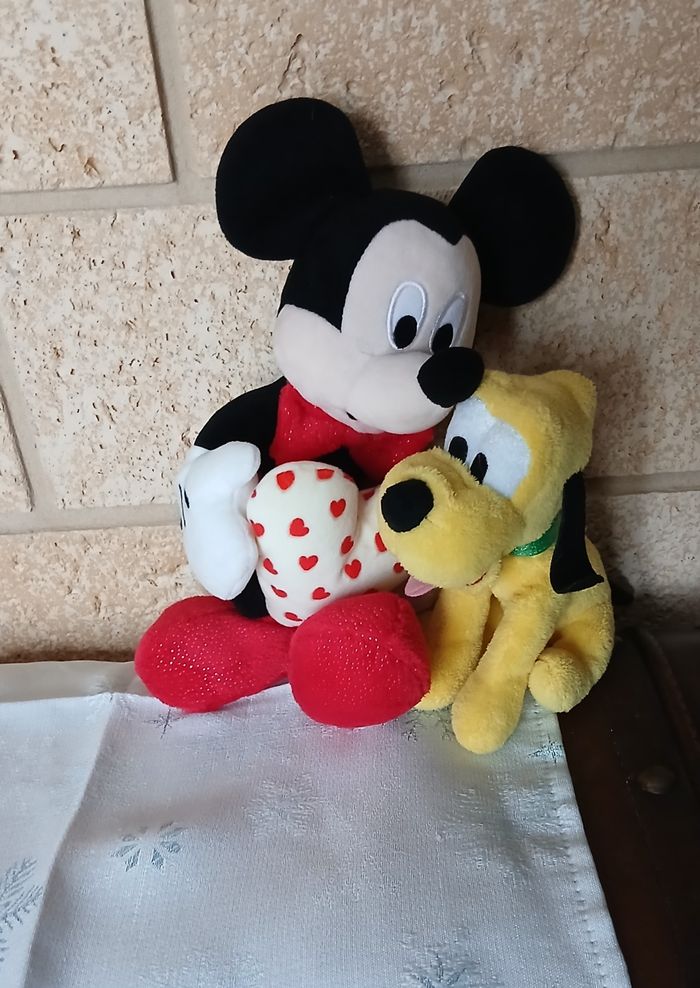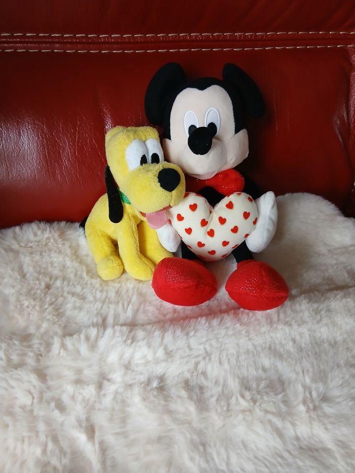 Doudous-peluches licence Disney. Pluto : entièrement rembourré; yeux brodés et museau souple; oreilles et langue en tissu feutré; collier non amovible. Hauteur totale de 14 cm; lavable à 30°. Mickey : entièrement rembourré; yeux brodés et museau souple; noeud papillon-chaussures-short en tissu rouge pailleté; cœur cousu aux mains. Hauteur maxi de 29 cm; ne tient pas debout // voir photos pour détails
