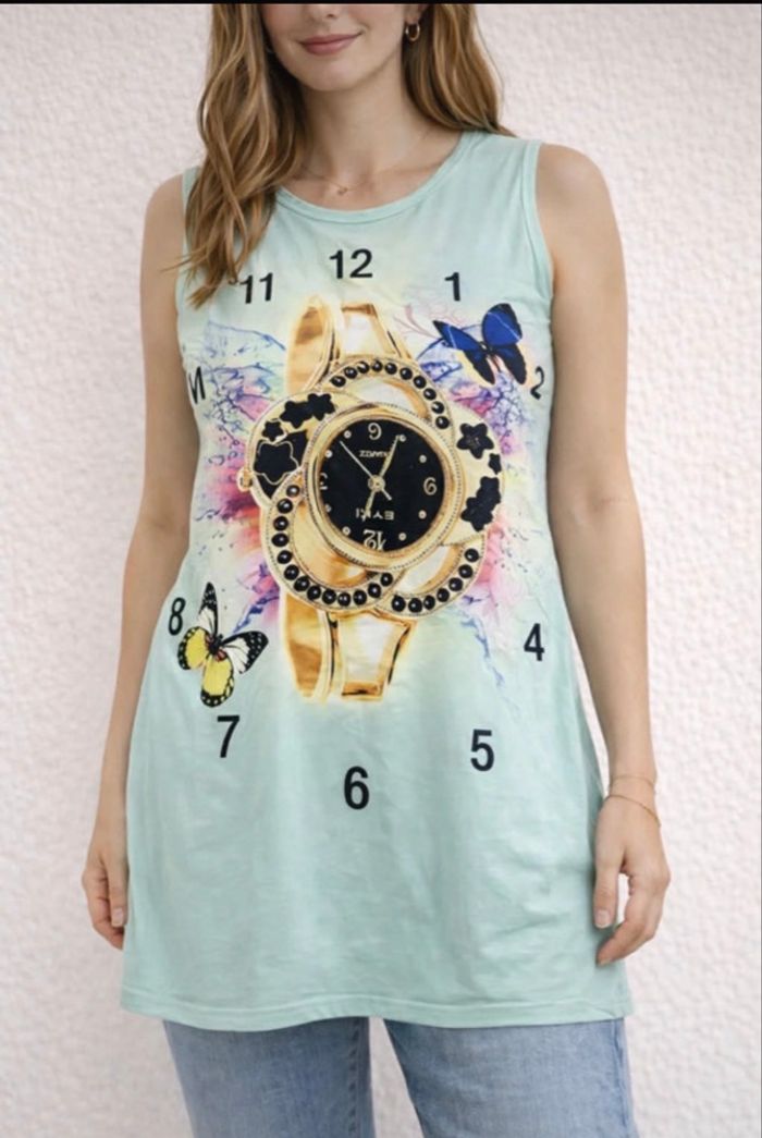 ✨ Haut sans manches très original avec grand imprimé “montre” et papillons colorés.