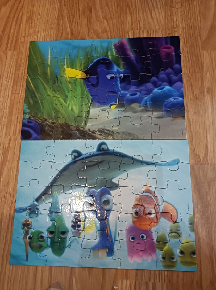 Lot de 2 puzzles Némo. Les 2 sont complets ! Le puzzle du dessus on a du recoller une petite partie du papier qui était partie (l'oeil de Dory) sinon est le reste est en très bon état