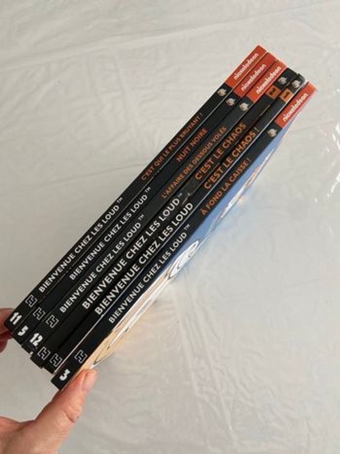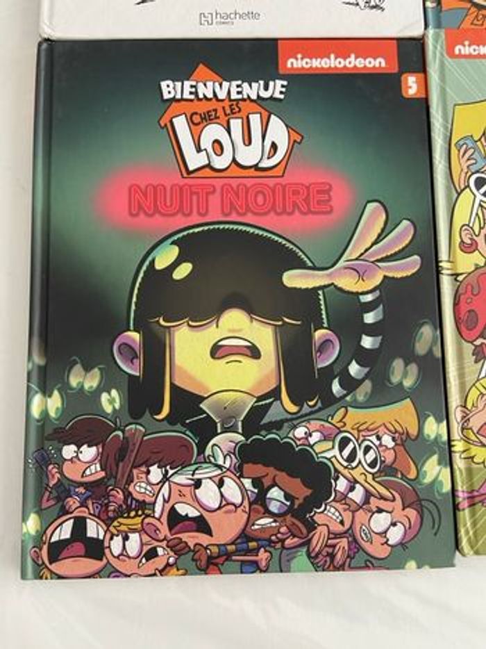 Vends un lot de 6 bandes dessinées de la série "Bienvenue chez les Loud" (Nickelodeon), éditées chez Hachette. Le lot comprend les titres suivants : Tome 1 : C'est le chaos ! Tome 2 : C'est le chaos ! Tome 3 : À fond la caisse ! Tome 5 : Nuit noire Tome 11 : C'est qui le plus bruyant ? Tome 12 : L'affaire des dessous volés État : Bon état général. Les couvertures et les tranches sont bien conservées.