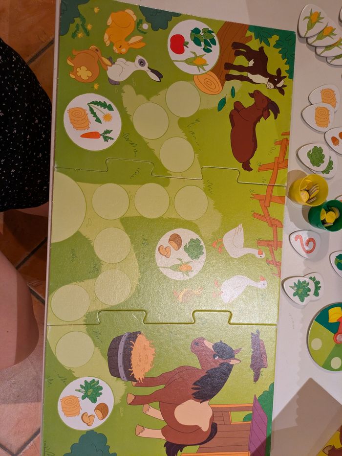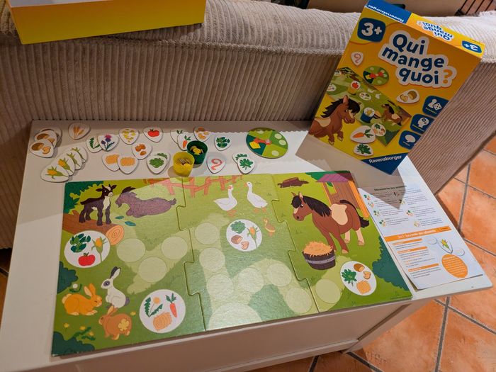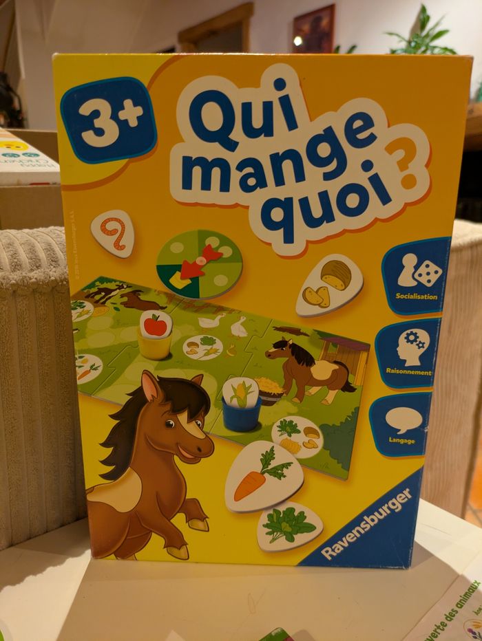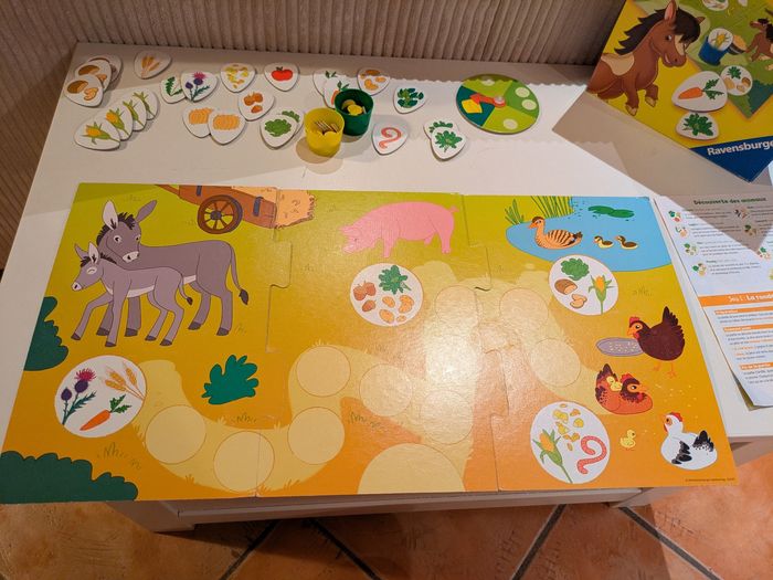 Jeu pour enfants qui mange quoi, où l'on apprend à nourrir les animaux en piochant des jetons nourriture