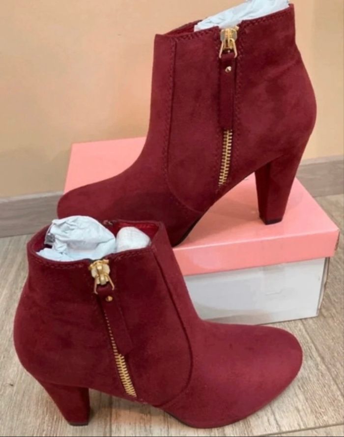 📦 bottines en suédine 🎨 bordeaux Jamais portées ! Dans leur boîte et emballage individuel Fermeture éclair intérieur et extérieur Celle de l'extérieur est une déco (ne s'ouvre pas!) Vendue 55€ sur internet 📏 de talon : 8 cm Pointure 36 ALLEGRA K 🚨remise sur lot activée ✨envoi rapide et soigné #Marjoriehec82130ChaussuresFemme ✨Marjoriehec✨