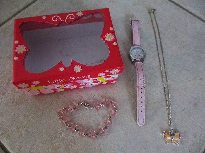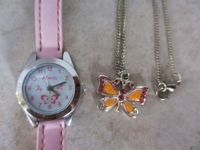 Ensemble montre, collier et bracelet motif papillons enfant marque Ravel Très bon état (la montre a été portée : petite marque sur le bracelet et la pile est à changer).