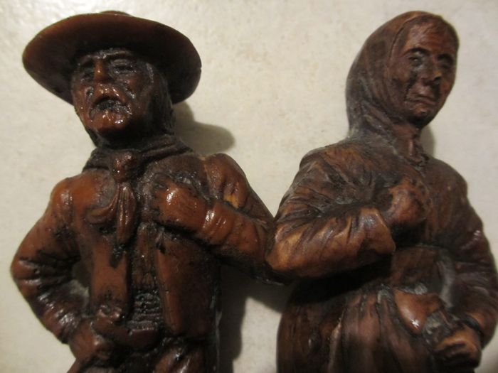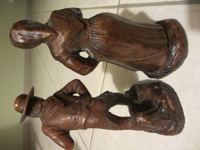 Statuettes fermiers en bois. Hauteur : 17 cm. Bon état (le nez du personnage féminin est cassé).