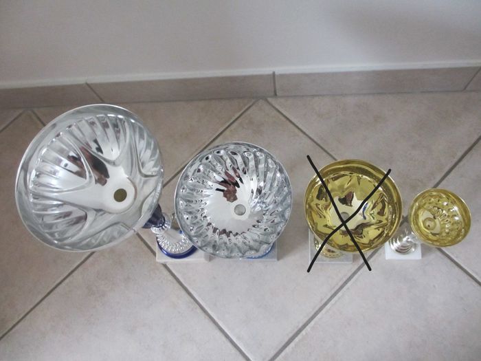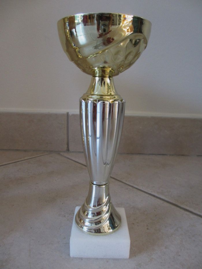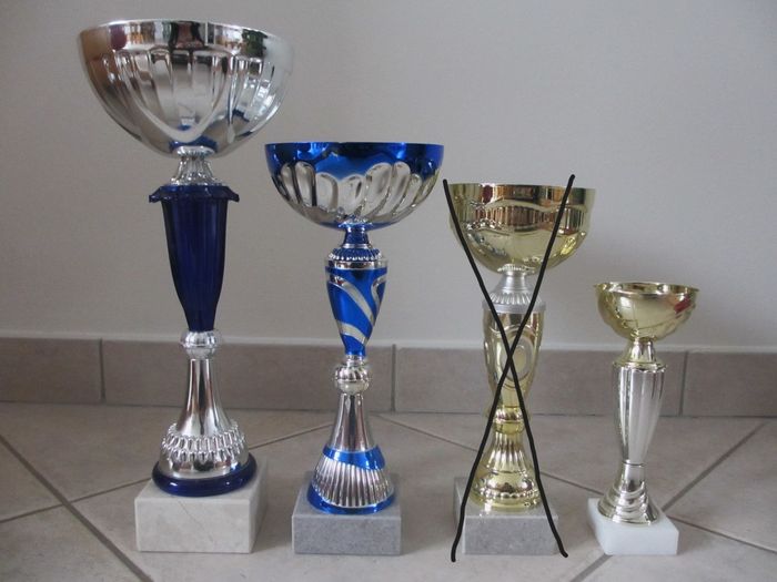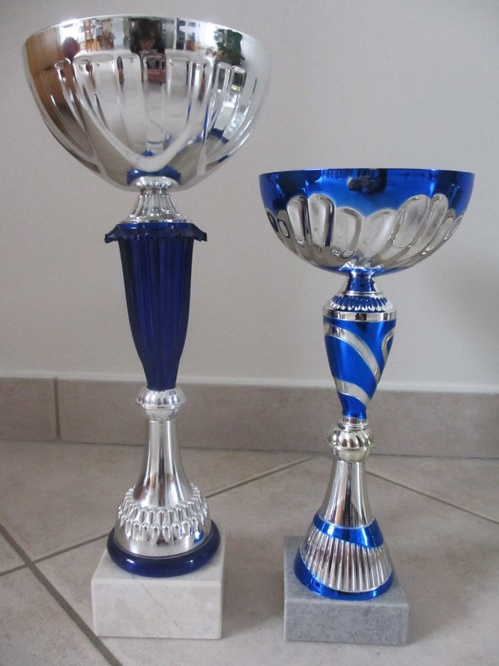Lot de 3 coupes sportives Hauteur : 34,5 cm, 28 cm et 18,5cm. Peuvent être vendues à l’unité. Très b