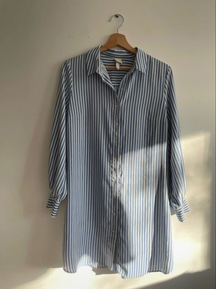 robe chemise, robe chemise rayée, robe rayures bleues, chemise longue, chemise oversize, robe oversize, robe fluide, robe courte, robe boyfriend, blue striped dress, shirt dress, summer dress, casual chic, look preppy, look casual, robe H&M, chemise H&M, tenue printemps, tenue été, robe demi saison, H&M dress, old school, manches bouffantes, long sleeves dress.