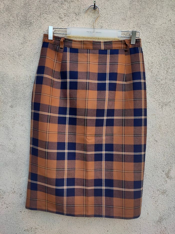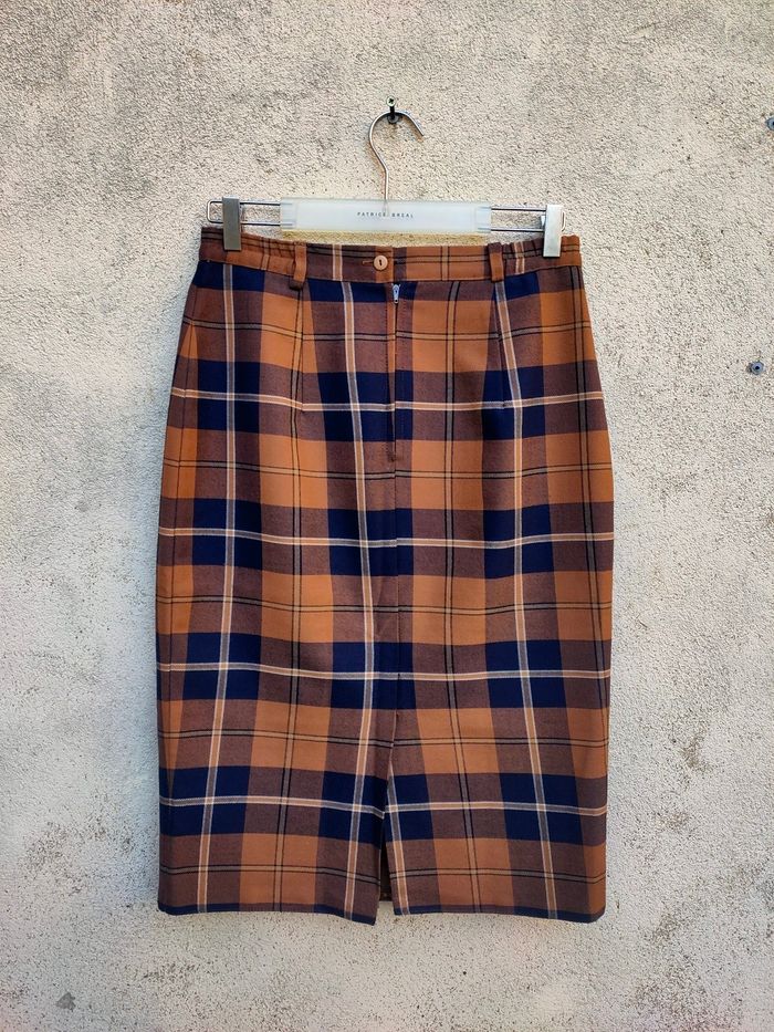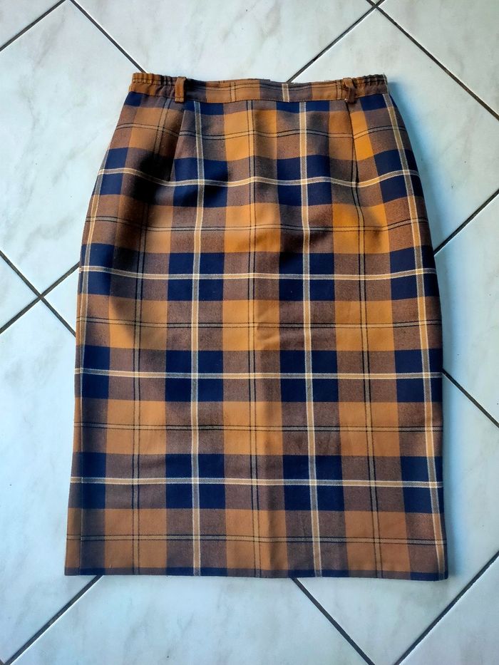 Jolie jupe motif Tartan coloris marron et marine, mi longue, bouton et fermeture éclair dans le dos, il y avait une élastiques de part et d'autre au niveau de la ceinture, celle ci n'est plus élastique et donne seulement l'effet froncé. Passant a la taille pour y mettre une ceinture au besoin. Model Vintage, taille 42 FR (étiquettes effacer mais ont aperçoit le taille 42). Les mesures sont détaillées dans l'annonce et en photos. Elle est en très bon état.