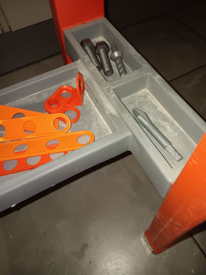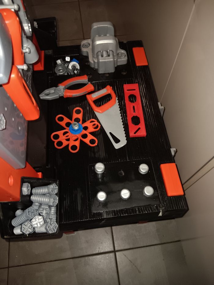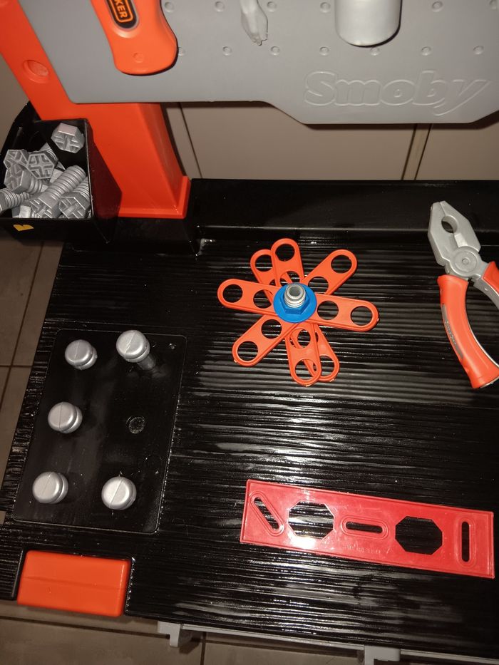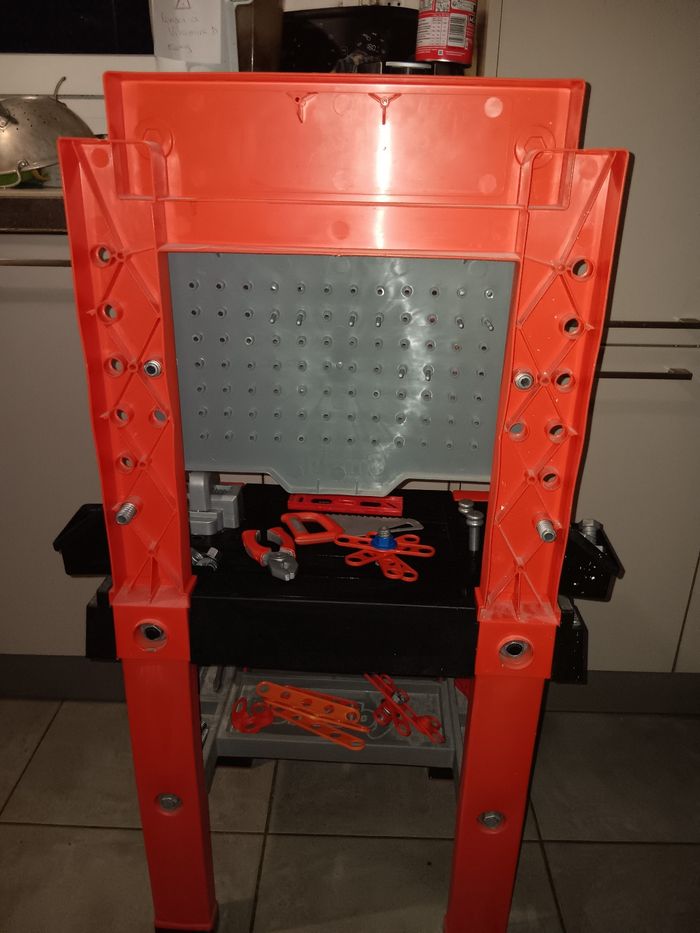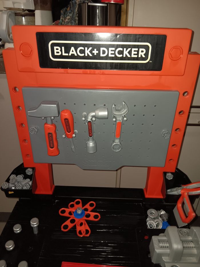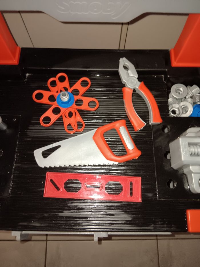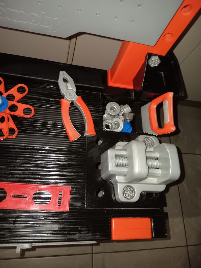 L'etabli Black+Decker de Smoby. Jouet magnifique pour les petits bricoleurs,. convient dès 3 ans. Il comprend un grand nombre de fonctionnalités et d'accessoires, ce qui en fait une garantie d'heures de plaisir et de bricolage pour les bricoleurs et les inventeurs. Avec beaucoup d accessoires, comme marteau, tournevis, pinces, clés et scie, 20 vis et un niveau. L'atelier pour garçons comprend plusieurs espaces de rangement et boîtes pour les petites vis et autres outils nécessaires pour un bricoleur. La table de travail pour garçons est dotée de 4 pieds stables et est fabriquée en plastique de qualité . En superbe état