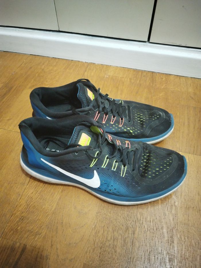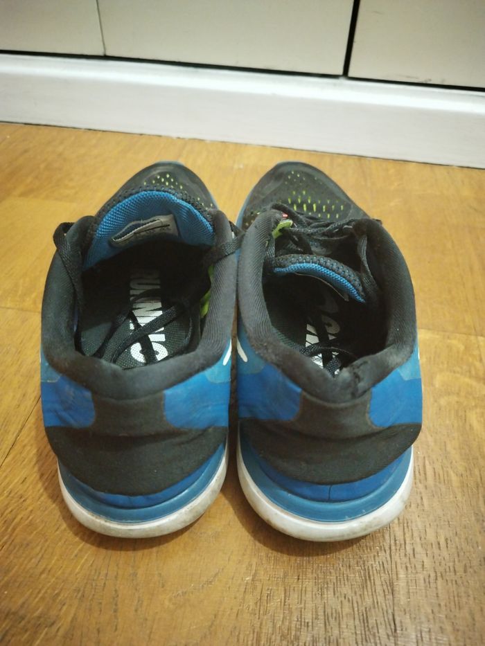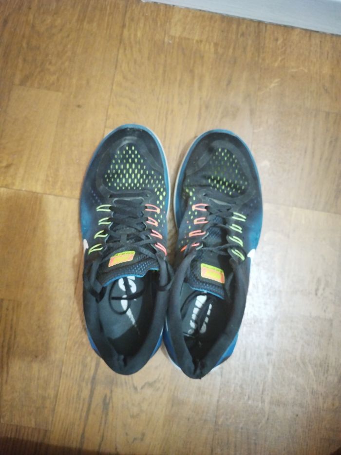 Je vends cette paire de baskets Nike, de couleur noire et bleue, avec quelques détails jaunes fluo et oranges fluo qui apportent une touche dynamique.