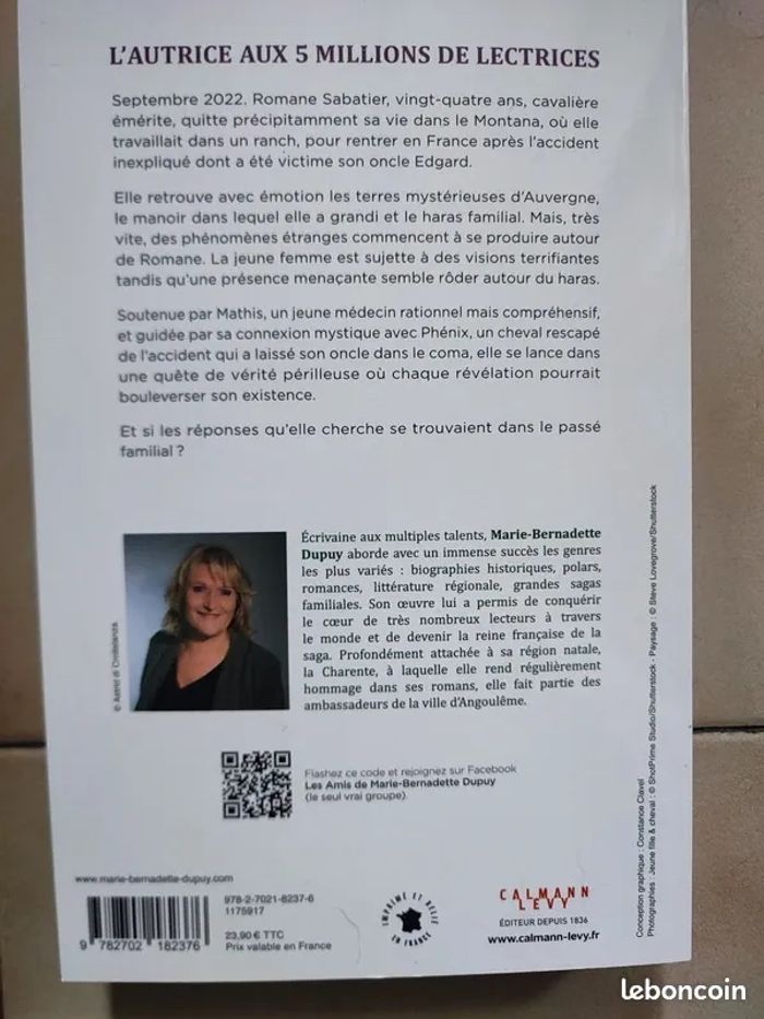 📘 Le Manoir des rêves perdus – Tome 1 : Les Caprices de la brume ✍️ Auteur : Marie-Bernadette Dupuy 🏛️ Éditeur : Calmann-Lévy 📖 Roman – Saga familiale / Mystère ✨ Description : Dans Le Manoir des rêves perdus – Les Caprices de la brume, Marie-Bernadette Dupuy entraîne le lecteur au cœur de l’Auvergne, entre secrets de famille, mystère et émotions. Romane, jeune cavalière, revient dans le domaine familial après un événement tragique. Très vite, des phénomènes étranges surviennent autour du manoir et du haras. Entre visions troublantes, passé enfoui et quête de vérité, elle devra affronter les secrets qui hantent son histoire. Un premier tome captivant, mêlant romance, suspense et atmosphère mystérieuse, signé par l’une des autrices préférées du public français. 📖 État : NEUF ✔️ Jamais lu ✔️ Pages intactes, couverture impeccable
