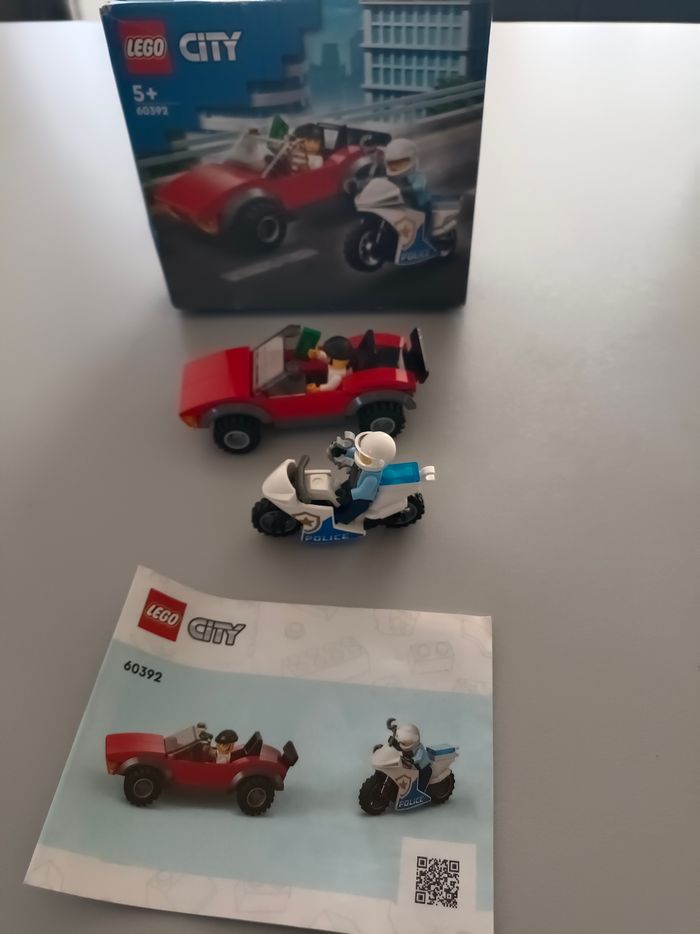 Stimulez l'imagination des enfants avec ce set débordant d'action. La course-poursuite de la moto de police LEGO® City (60392) inclut une moto pour la course-poursuite et une voiture de sport pour la fuite du voleur. Ajoutez des minifigurines de policier et de voleur, un billet de banque et une touche d'imagination pour jouer pendant des heures. Les instructions numériques interactives enrichissent le jeu Ce set 5+ s'accompagne d'instructions illustrées étape par étape. Un guide interactif est également disponible dans l'appli LEGO Builder : il propose des outils de zoom et de rotation permettant aux enfants de visualiser les modèles à 360° pendant la construction et de bénéficier d'une expérience encore plus amusante. Des jouets qui stimulent l'imagination Avec les sets LEGO City, les enfants sont au cœur de l'action : ils inventent des histoires et s'amusent à l'infini avec des bâtiments fonctionnels, des véhicules fascinants et des personnages amusants. Les photos valent description. Set complet, vérifié par une personne expérimentée en Lego N'hésitez pas à regarder mes autres ventes Lego et à vous abonner car j'ai encore plein de Lego à publier #jeuxjouetscamilled974